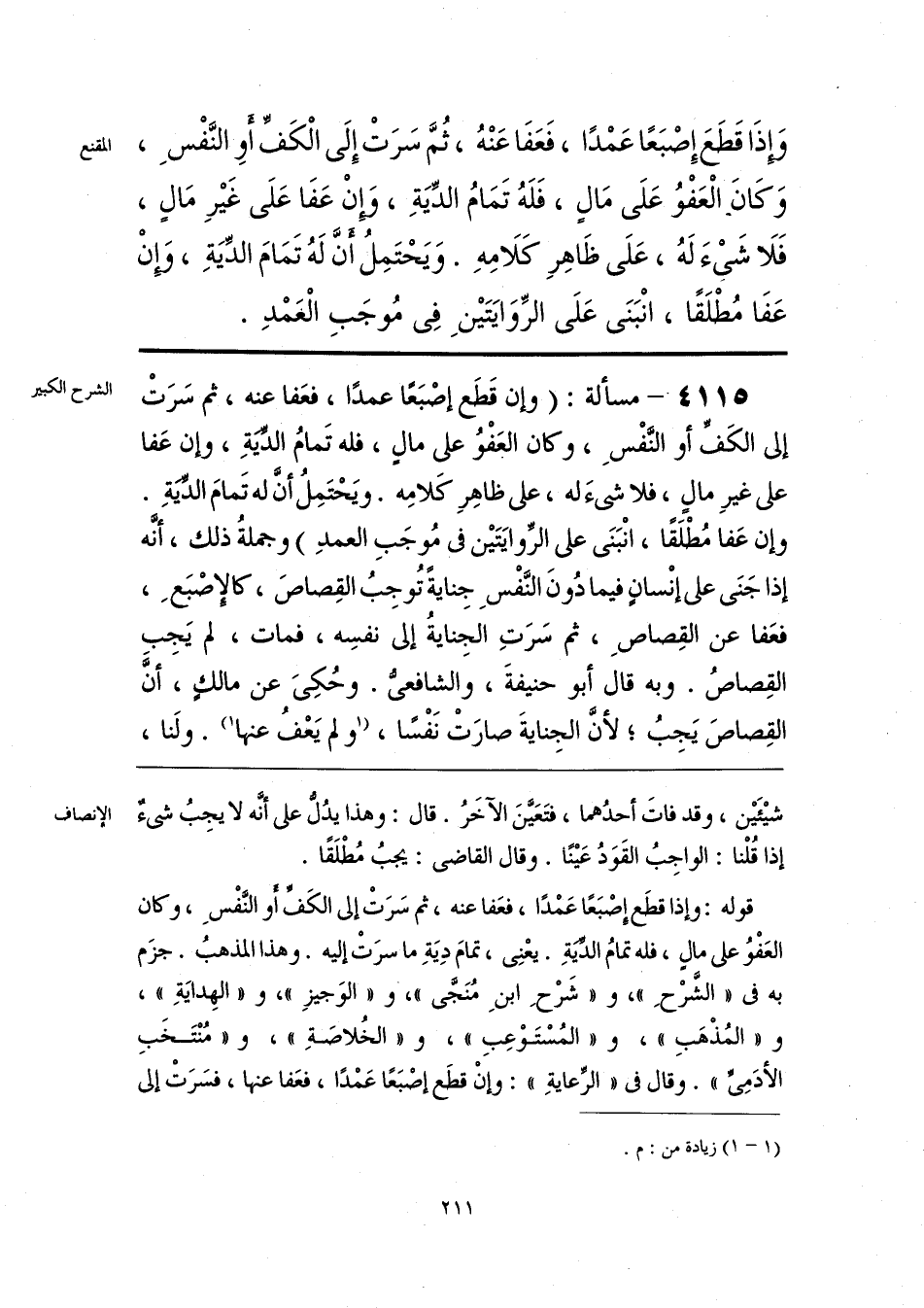 قوله: وإذا قطَع إصْبَعًا عَمْدًا، فعَفا عنه، ثم سَرَتْ إلى الكَفِّ أو النَّفْس، وكان العَفْوُ على مالٍ، فله تمامُ الدِّيَةِ. يعْنِى، تمامَ دِيَةِ ما سرَتْ إليه. وهذا المذهبُ. جزَم به فى «الشَّرْحِ»، و «شَرْحِ ابنِ مُنَجَّى»، و «الوَجيزِ»، و «الهِدايَةِ»، و «المُذْهَبِ»، و «المُسْتَوْعِبِ»، و «الخُلاصَةِ»، و «مُنْتَخَبِ الأدَمِىِّ». وقال فى «الرِّعايَةِ»: وإنْ قطَع إصْبَعًا عَمْدًا، فعَفا عنها، فسَرَتْ إلى