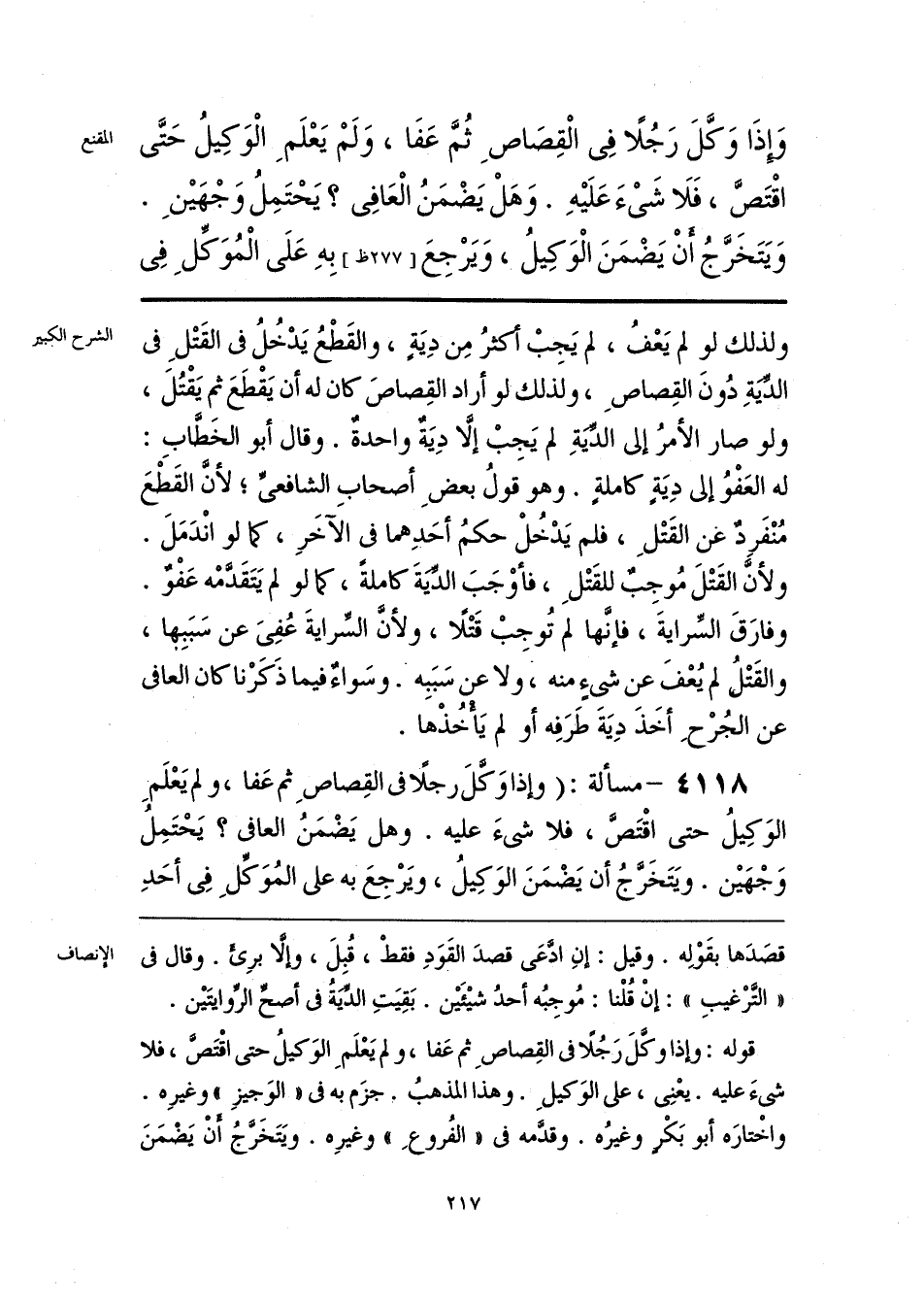 وَإِذَا وَكَّلَ رَجُلًا فِى الْقِصَاصِ ثُمَّ عَفَا، وَلَمْ يَعْلَمِ الْوَكِيلُ حَتَّى اقْتَصَّ، فَلَا شَىْءَ عَلَيْهِ. وَهَلْ يَضْمَنُ الْعَافِى؟ يَحْتَمِلُ وَجْهَيْنِ. وَيَتَخرَّجُ أَنْ يَضْمَنَ الْوَكِيلُ، وَيَرْجِعَ بِهِ عَلَى الْمُوَكِّلِ فِى