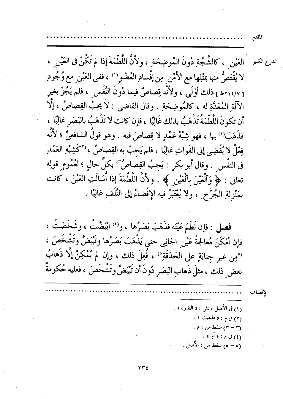 العَيْنِ، كالشَّجَّةِ دُونَ المُوضِحَةِ، ولأَنَّ اللَّطْمَةَ إذا لم تَكُنْ في العَيْنِ، لا يُقْتَصُّ منها بمثْلِها مع الأمْنِ مِن إفْسادِ العُضْوِ (¬1)، ففى العَيْنِ مع وُجُودِ ذلك أوْلَى، ولأنَّه قِصاصٌ فيما دُونِ النَّفْسِ، فلم يَجُزْ بغيرِ الآلَةِ المُعَدَّةِ له، كالمُوضِحَةِ. وقال القاضى: لا يجبُ القِصاصُ، إلَّا أن تكونَ اللَّطْمَةُ تَذْهَبُ بذلك غَالِبًا، فإن كانت لا تَذْهَبُ بالبَصَرِ غالِبًا، فذَهَبَ (¬2) بها، فهو شِبْهُ عَمْدٍ لا قِصاصَ فيه. وهو قولُ الشافعىِّ؛ لأنَّه فِعْلٌ لا يُفْضِى إلى الفَواتِ غالِبًا، فلم يَجِبْ به القِصاصُ، [كَشِبْهِ العَمْدِ في النفْسِ. وقال أبو بكرٍ: يَجِبُ القِصاصُ] (¬3) بكلِّ حالٍ؛ لعُمُومِ قولِه تعالى: {وَالْعَيْنَ بِالْعَيْنِ}. ولأَنَّ اللَّطْمَةَ إذا أَسَالَتِ العَيْنَ، كانت بمَنْزِلةِ الجُرْحِ، ولا يُعْتَبَرُ فيه الإِفْضاءُ إلى التَّلَفِ غالِبًا.