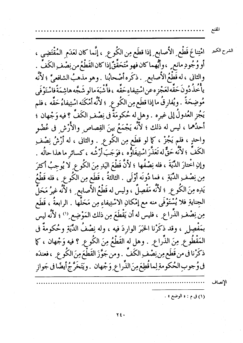 امْتِناعَ قَطْعِ الأصابعِ إذا قطَع مِن الكُوعِ، إنَّما كان لعَدَمِ المُقْتَضِى، أو وُجُودِ مانعٍ، وأيُّهما كان فهو مُتَحَقِّقٌ إذا كان القَطْعُ من نِصْفِ الكَفِّ. والثانى، له قَطْعُ الأصابعِ. ذكَره أصْحابُنا. وهو مذهبُ الشافعىِّ؛ لأنَّه يأْخُذُ دُونَ حَقِّه لعَجْزِه عن اسْتِيفاءِ حَقِّه، فأَشْبَهَ ما لو شَجَّه هاشِمَةً فاسْتَوْفَى مُوضِحَةً. ويُفارِقُ ما إذا قطَع مِن الكُوعِ؛ لأنَّه أمْكَنَه اسْتِيفاءُ حَقِّه، فلم يَجُزِ العُدولُ إلى غيرِه. وهل له حُكومَةٌ في نِضفِ الكَفِّ؟ فيه وَجْهان؛ أحدُهما، ليس له ذلك؛ لأنَّه يَجْمَعُ بينَ القِصاصِ والأَرْشِ في عُضْوٍ واحدٍ، فلم يَجُزْ، كما لو قطَع مِن الكُوعِ. والثانى، له أَرْشُ نِصْفِ الكَفِّ؛ لأنَّه حَقٌّ له تَعَذَّرَ اسْتِيفَاؤُه، فوَجَبَ أرْشُه، كسائرِ ما هذا حالُه. وإنِ اخْتارَ الدِّيَةَ، فله نِصْفُها؛ لأَنَّ قَطْعَ اليَدِ مِنَ الكُوعِ لا يُوجِبُ أكثرَ مِن نِصْفِ الدِّيَةِ، فما دُونَه أوْلَى. الثَّالثةُ، قَطَع مِن الكُوعِ، فله قَطْعُ يَدِه مِنَ الكُوعِ؛ لأنَّه مَفْصِلٌ، وليس له قَطْعُ الأصابعِ؛ لأنَّه غيرُ مَحَلِّ الجِنايةِ فلا يُسْتَوْفَى منه مع إمْكانِ الاسْتِيفاءِ مِن مَحَلِّها. الرابعةُ، قَطَع مِن نِصْفِ الذِّراعِ، فليس له أن يَقْطَعَ مِن ذلك المَوْضِعِ (¬1)؛ لأنَّه ليس بمَفْصِلٍ، وقد ذكَرْنا الخبَرَ الوارِدَ فيه، وله نِصْفُ الدِّيَةِ وحُكومةٌ في المَقْطُوعِ مِنَ الذِّراعِ. وهل له القَطْعُ مِنَ الكُوعِ؟ فيه وَجْهان، كما ذكَرْنا في من قَطَع مِن نِصْفِ الكَفِّ. ومن جَوَّزَ القَطْعَ مِنَ الكُوعِ، فعندَه في وُجوبِ الحُكومةِ لِما قُطِعَ مِنَ الذِّراعِ وَجْهان. ويَتَخرجُ أيضًا في جَوازِ
