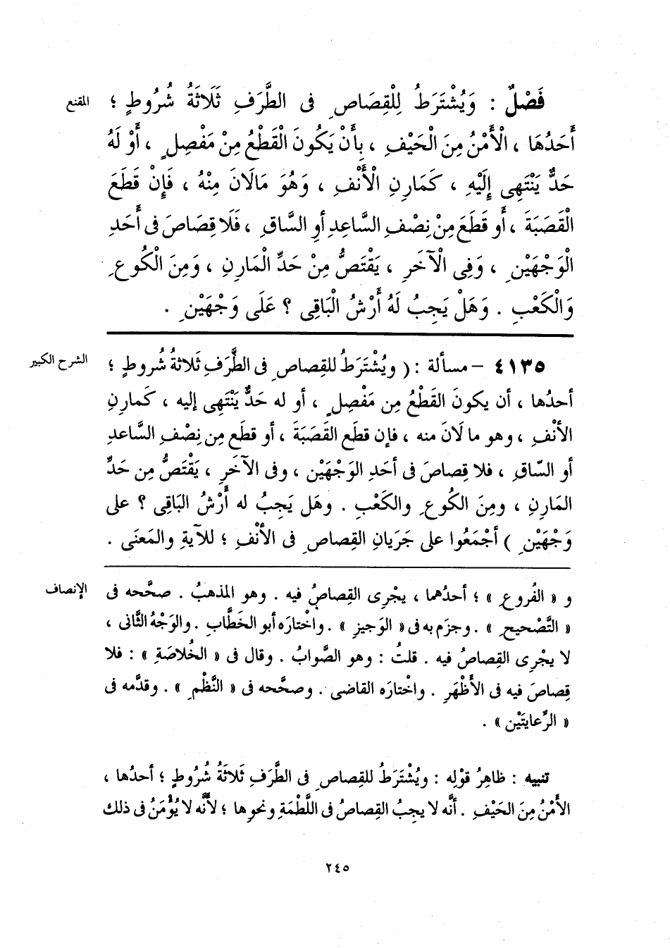 فَصْلٌ: وَيُشْتَرَطُ لِلْقِصَاصِ فى الطَّرَفِ ثَلَاثَةُ شُرُوطٍ؛ أَحَدُهَا، الْأَمْنُ مِنَ الْحَيْفِ، بأَنْ يَكُونَ الْقَطْعُ مِنْ مَفْصِلٍ، أَوْ لَهُ حَدٌّ يَنْتَهِى إِلَيْهِ، كَمَارِنِ الْأَنْفِ، وَهُوَ مَا لَانَ مِنْهُ، فَإِنْ قَطَعَ الْقَصَبَةَ، أَو قَطَعَ مِنْ نِصْفِ السَّاعِدِ أوِ السَّاقِ، فَلَا قِصَاصَ فى أَحدِ الْوَجْهَيْنِ، وَفِى الْآخَرِ، يَقْتَصُّ حَدِّ الْمَارِنِ، وَمِنَ الْكُوعِ وَالْكَعْبِ. وَهَلْ يَجِبُ لَهُ أَرْشُ الْبَاقِى؟ عَلَى وَجْهَيْنِ.