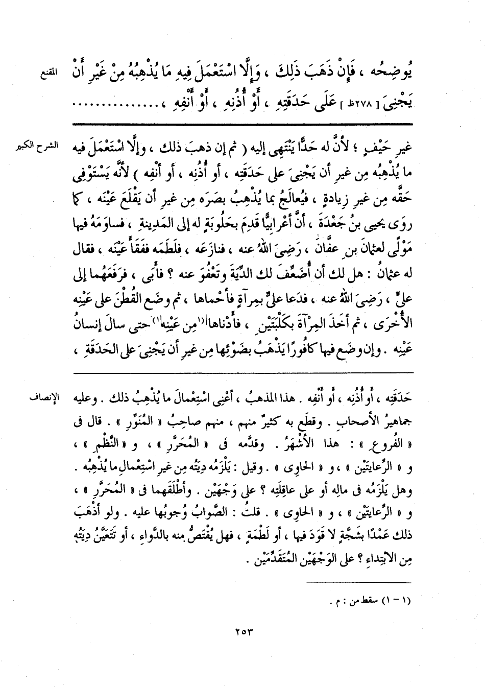 حَدَقَتِه، أو أُذُنِه، أو أَنْفِه. هذا المذهبُ، أعْنِى اسْتِعْمالَ ما يُذْهِبُ ذلك. وعليه جماهيرُ الأصحابِ. وقطَع به كثيرٌ منهم، منهم صاحِبُ «المُنَوِّرِ». قال فى «الفُروعِ»: هذا الأشْهَرُ. وقدَّمه فى «المُحَرَّرِ»، و «النَّظْمِ»، و «الرِّعايتَيْن»، و «الحاوِى». وقيل: يَلْزَمُه دِيَتُه مِن غيرِ اسْتِعْمالِ ما يُذْهِبُه. وهل يَلْزَمُه فى مالِه أو على عاقِلَتِه؟ على وَجْهَيْن. وأطْلَقَهما فى «المُحَرَّرِ»، و «الرِّعايتَيْن»، و «الحاوِى». قلتُ: الصَّوابُ وُجوبُها عليه. ولو أذْهَبَ ذلك عَمْدًا بشَحةٍ لا قَوَدَ فيها، أو لَطْمَةٍ، فهل يُقْتَصُّ منه بالدَّواءِ، أو تَتَعَيَّنُ دِيَتُه مِن الابْتِداءِ؟ على الوَجْهَيْن المُتَقَدِّمَيْن.