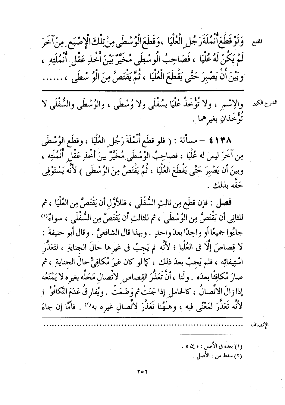 وَلَوْ قَطَعَ أُنْمُلَةَ رَجُلٍ الْعُلْيَا، وَقَطَعَ الْوُسْطَى مِنْ تِلْكَ الإِصْبَعِ مِنْ آخَرَ لَمْ يَكُنْ لَهُ عُلْيَا، فَصَاحِبُ الُوسْطَى مُخَيَّرٌ بَيْنُ أَخْذِ عَقْلِ أُنْمُلَتِهِ، وبَيْنَ أَنْ يَصْبِرَ حَتَّى يَقْطَعَ الْعُلْيَا، ثُمَّ يَقْتَصَّ مِنَ الْوُسْطى،