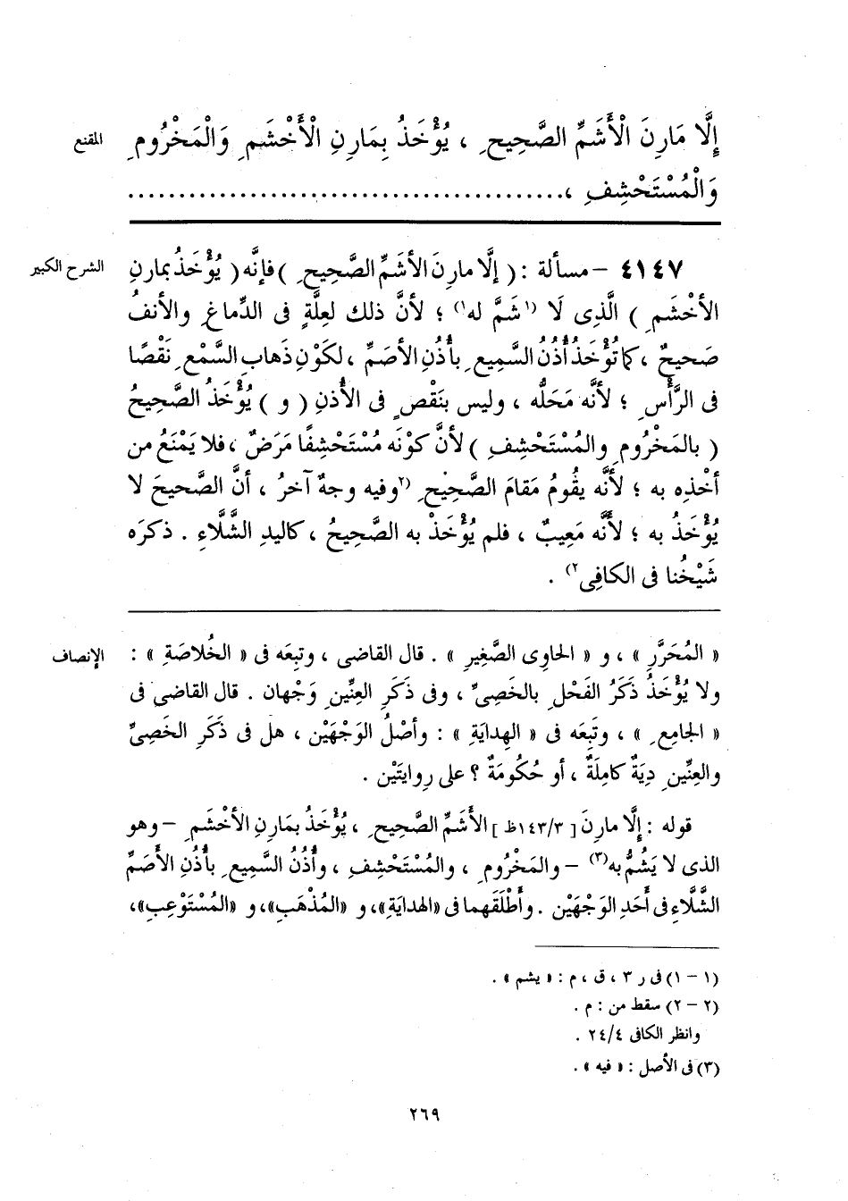 قوله: إلَّا مارِنَ الأشَمِّ الصَّحِيحِ، يُؤْخَذُ بمَارِنِ الأخْشَمِ -وهو الذى لا يَشُمُّ به (¬1) - والمَخْرُومِ، والمُسْتَحْشِفِ، وأُذُنُ السَّمِيعِ بأُذُنِ الأَصَمِّ الشَّلَّاءِ فى أحَدِ الوَجْهَيْن. وأَطْلَقَهما فى «الهدايَةِ»، و «المُذْهَبِ»، و «المُسْتَوْعِبِ»،