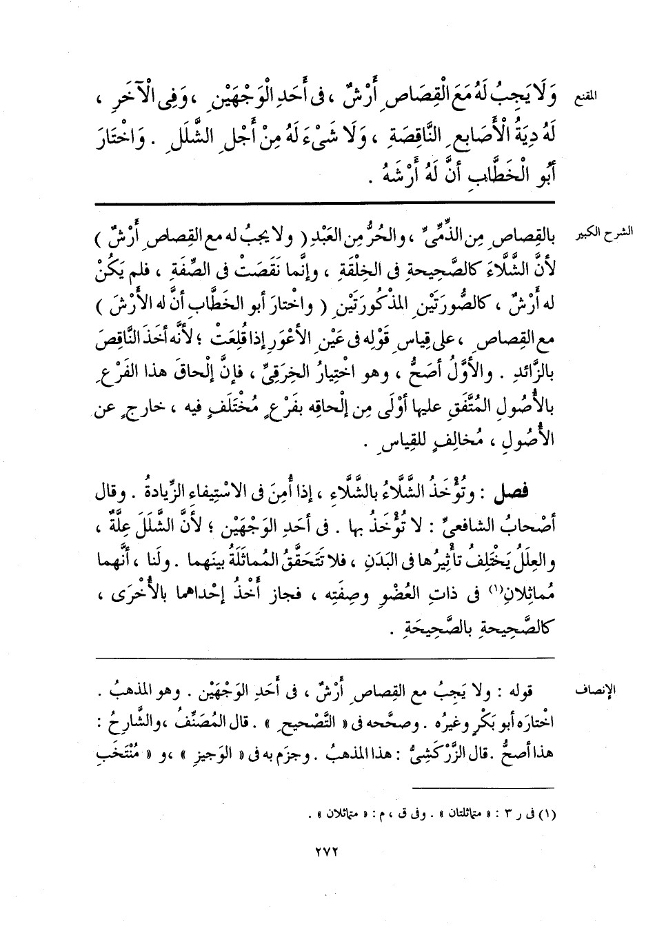 وَلَا يَجِبُ لَهُ مَعَ الْقِصَاصِ أَرْشٌ، فى أَحَدِ الْوَجْهَيْنِ، وَفِى الْآخَرِ، لَهُ دِيَةُ الْأَصَابِعِ النَّاقِصَةِ، وَلَا شَىْءَ لَهُ مِنْ أَجْلِ الشَّلَلِ. وَاخْتَارَ أبو الْخَطَّابِ أنَّ لَهُ أَرْشَهُ.