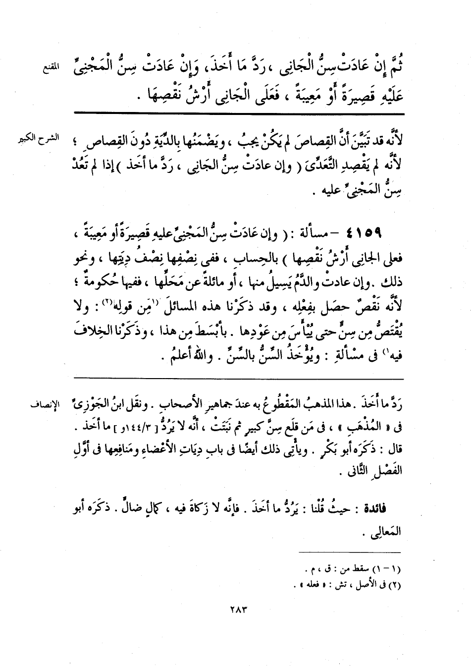 ثُمَّ إِنْ عَادَتْ سِنُّ الْجَانِى، رَدَّ مَا أَخَذَ، وَإِنْ عَادَتْ سِنُّ الْمَجْنِىِّ عَلَيْهِ قَصِيرَةً أَوْ مَعِيبَةً، فَعَلَى الْجَانِى أَرْشُ نَقْصِهَا.