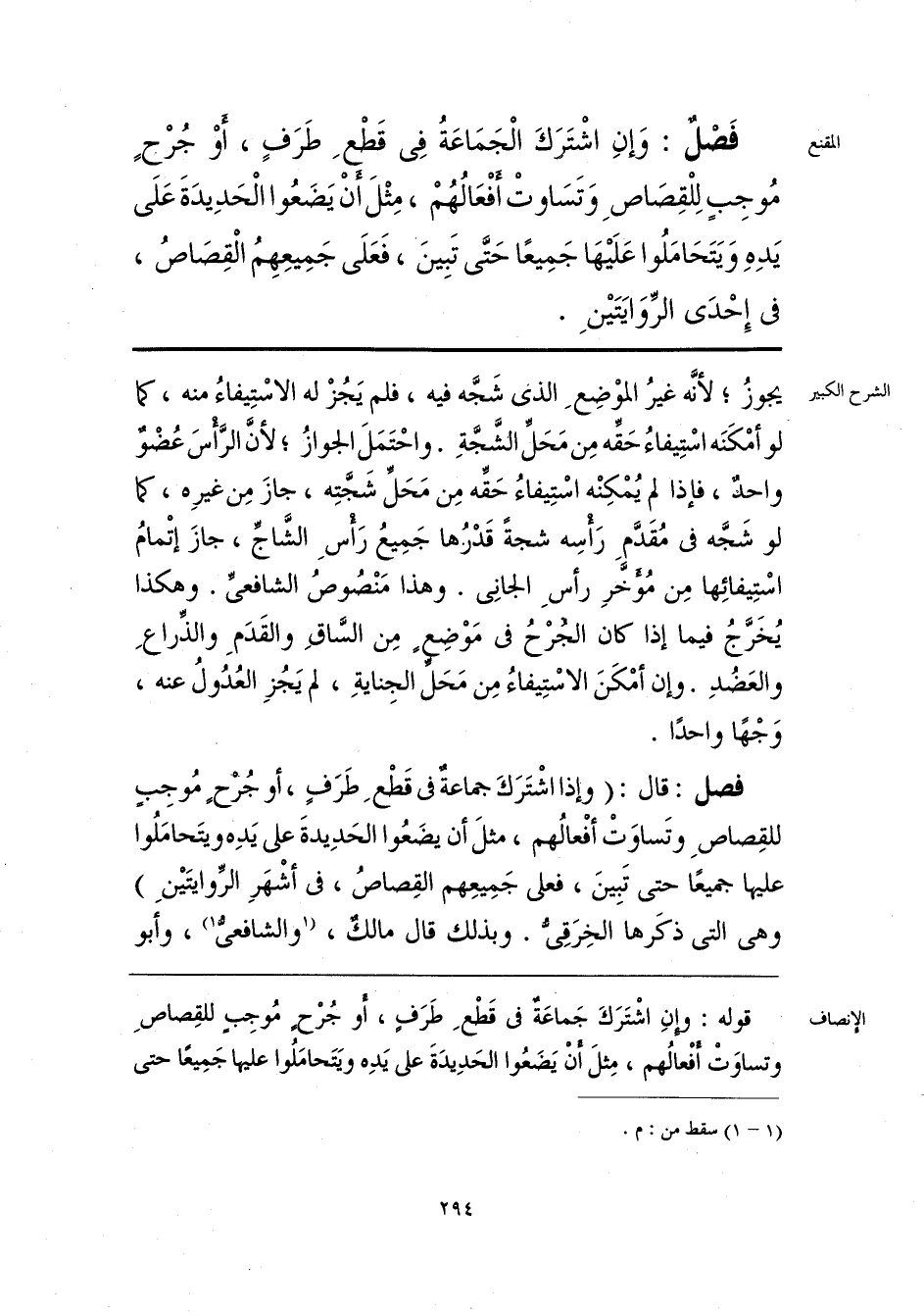 فَصْلٌ: وَإِنِ اشْتَرَكَ الْجَمَاعَةُ فِى قَطعِ طَرَفٍ، أَوْ جُرجٍ مُوجاٍ لِلْقِصَاصِ وَتَسَاوتْ أفْعَالُهُم، مِثْلَ أَنْ يَضَعُوا الْحَدِيدَةَ عَلَى يَدِهِ وَيَتَحَامَلُوا عَلَيْها جَمِيعًا حَتَّى تَبِينَ، فَعَلَى جَمِيعِهِمُ الْقِصَاصُ، فى إحدَى الرِّوَايَتَيْن.