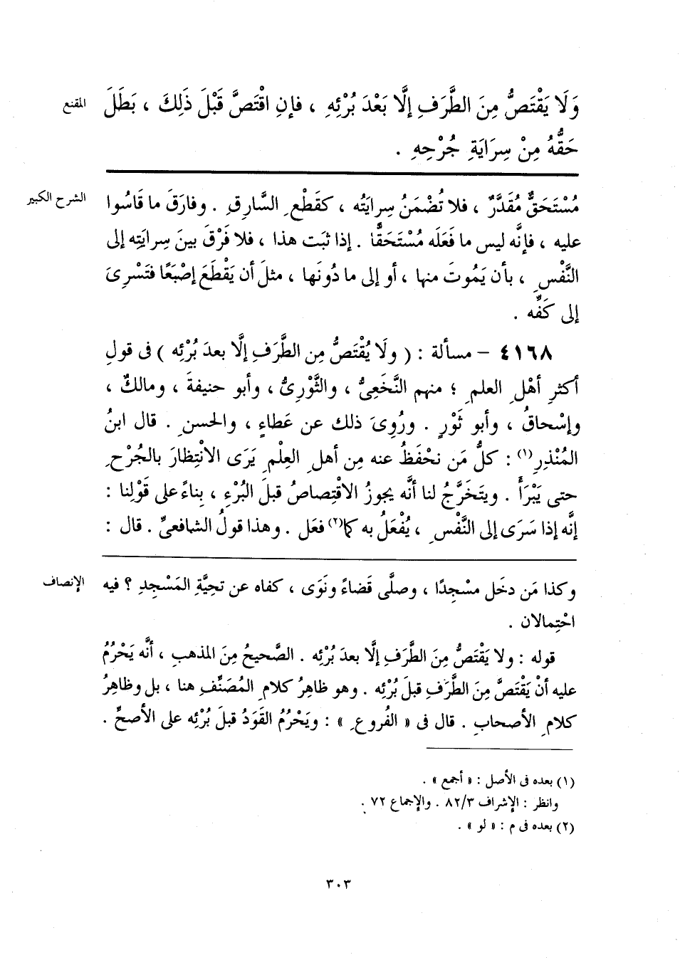 قوله: ولا يَقْتَصُّ مِنَ الطَّرَفِ إلا بعدَ بُرْئِه. الصَّحيحُ مِنَ المذهبِ، أنَّه يَحرُمُ عليه أَنْ يَقْتَصَّ مِنَ الطَّرَفِ قبلَ بُرْئِه. وهو ظاهِرُ كلامِ المُصَنِّفِ هنا، بل وظاهِرُ كلامِ الأصحابِ. قال فى «الفُروعِ»: ويَحرُمُ القَوَدُ قبلَ بُرْئِه على الأصحِّ.