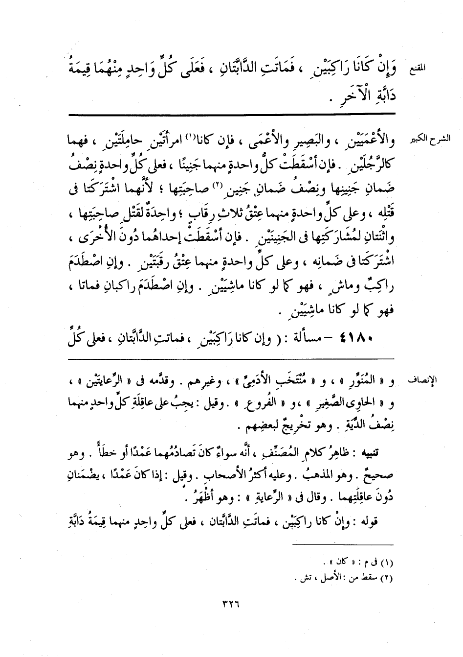 قوله: وإنْ كانا راكِبَيْن، فماتَتِ الدَّابَّتان، فعلى كلِّ واحِدٍ منهما قِيمَةُ دَابَّةِ