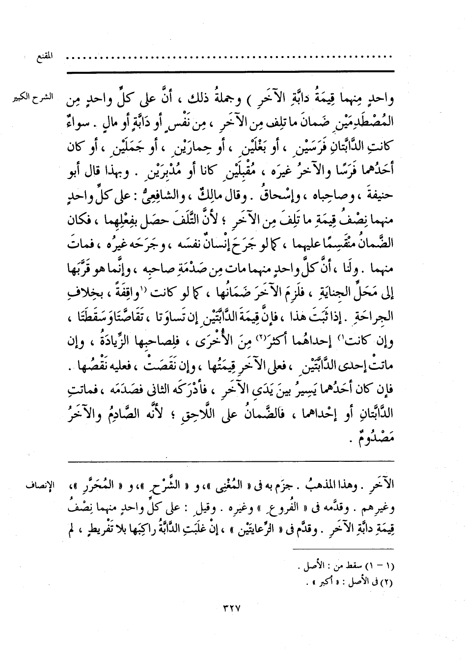 الآخَرِ. وهذا المذهبُ. جزَم به فى «المُغْنِى»، و «الشَّرْحِ»، و «المُحَرَّرِ»، وغيرِهم. وقدَّمه فى «الفُروعِ» وغيرِه. وقيلِ: على كل واحدٍ منهما نِصْفُ قِيمَةِ دابَّةِ الآخَرِ. وقدَّم فى «الرِّعايتَيْن»، إنْ غلَبَتِ الدَّابَّةُ راكِبَها بلا تَفريطٍ، لم