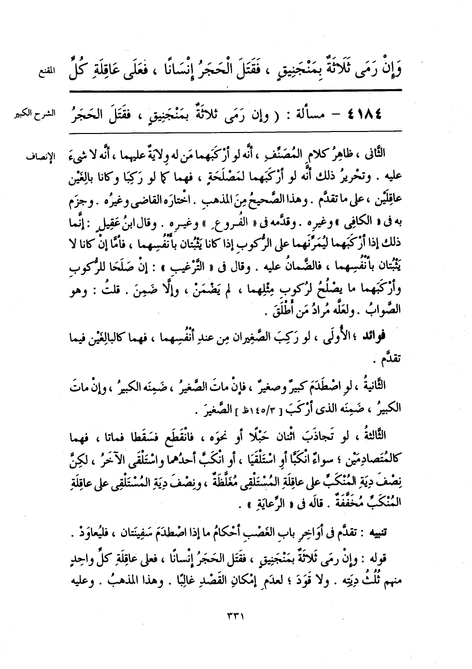 وَإِنْ رَمَى ثَلَاثَةٌ بِمَنْجَنِيقٍ، فَقَتَلَ الْحَجَرُ إنْسَانًا، فعَلَى عَاقِلَةِ كُلِّ
