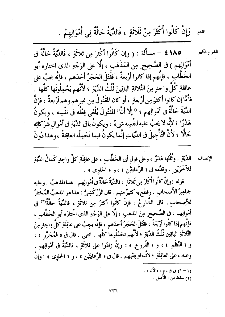 الدِّيَةِ. وثُلُثُها هَدَرٌ، وعلى قولِ أبى الخَطَّابِ، على عاقِلَةِ كلِّ واحِدٍ كَمالُ الدِّيَةِ للآخَرَيْنَ. وقدَّمه فى «الرِّعايتَيْن»، و «الحاوِى».
