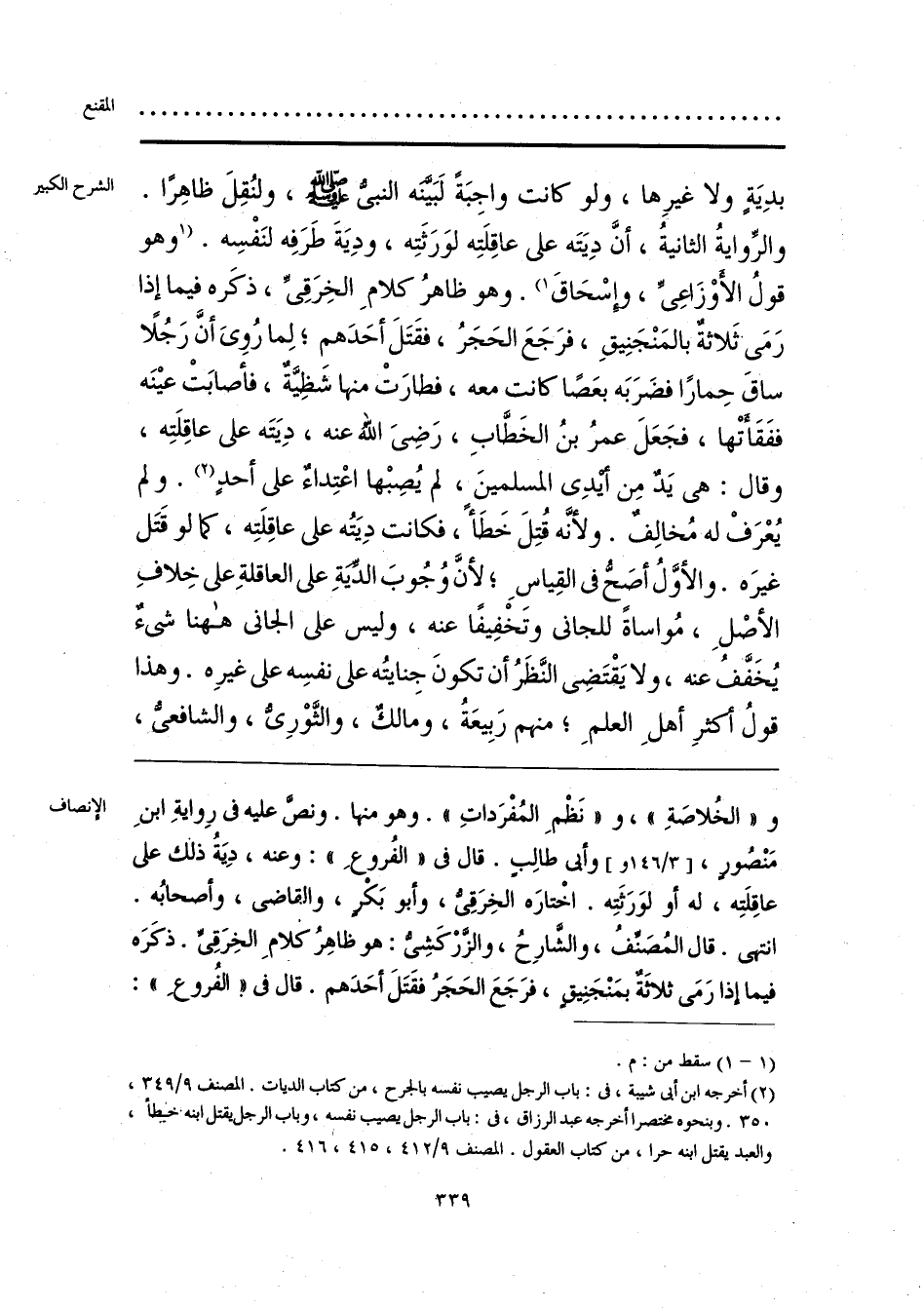 و «الخُلاصَةِ»، و «نَظْمِ المُفْرَداتِ». وهو منها. ونصَّ عليه فى رِوايةِ ابنِ مَنْصُورٍ، وأبى طالِبٍ. قال فى «الفُروعِ»: وعنه، دِيَةُ ذلك على عاقِلَتِه، له أو لوَرَثَتِه. اخْتارَه الخِرَقِىُّ، وأبو بَكْرٍ، والقاضى، وأصحابُه. انتهى. قال المُصَنِّفُ، والشَّارِحُ، والزَّرْكَشِىُّ: هو ظاهِرُ كلامِ الخِرَقِىِّ. ذكَرَه فيما إذا رَمَى ثلَاثةٌ بمَنْجَنِيقٍ، فرَجَعَ الحَجَرُ فقَتَلَ أحَدَهم. قال فى «الفُروعِ»: