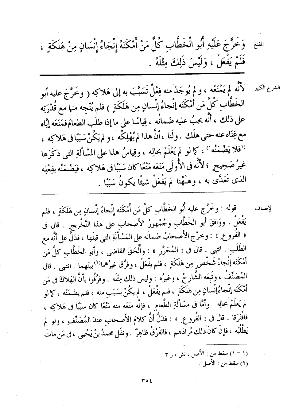 قوله: وخَرَّج عليه أَبُو الخَطَّابِ كلَّ مَن أَمْكَنَه إنْجاءُ إنْسانٍ مِن هَلَكَةٍ، فلم يَفْعَلْ. ووَافقَ أبو الخَطَّابِ وجُمْهورُ الأصحابِ على هذا التَّخْريجِ. قال فى «الفُروعِ»: وخرَّج الأصحابُ ضَمانَه على المَسْألَةِ التى قبلَها، فدَلَّ على أنَّه مع الطَلَبِ. انتهى. قال فى «المُحَرَّرِ»: والحَقَ القاضى، وأبو الخَطَّابِ كلَّ مَن أمْكَنَه إنْجاءُ شَخْصٍ مِن هَلَكَةٍ، فلم يفْعَلْ، وفرَّق غيرُهما (¬1) بينَهما. انتهى. قال المُصَنِّفُ، وتَبِعَه الشَّارِحُ، وغيرُه: وليس ذلك مِثْلَه. وفرَّقُوا بأنَّ الهَلاكَ فى مَن أمْكَنَه إنْجاءُ إنْسانٍ مِن هَلَكَةٍ، فلم يفْعَلْ، لم يكُنْ بسَبَبٍ منه، فلم يضمَنْه، كما لو لم يَعلَمْ بحالِه. وأمَّا فى مسْألَةِ الطَّعام، فإنَّه منَعَه منه مَنْعًا كان سبَبًا فى هَلاكِه، فافْتَرَقا. قال فى «الفُروعِ»: فدَلَّ أَنَّ كلامَ الأصحابِ عندَ المُصَنِّفِ، ولو لم يَطْلُبْه، فإنْ كانَ ذلك مُرادَهم، فالفَرْقُ ظاهِرٌ. ونقَل محمدُ بنُ يَحْيى، فى مَن ماتَ