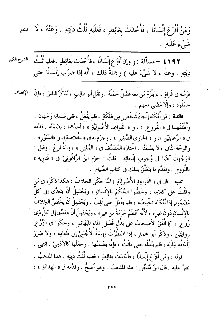 فائدة: مَن أَمْكَنَه إنْجاءُ شَخْصٍ مِن هَلَكَةٍ، فلم يفْعَلْ، ففى ضَمانِه وَجْهان. وأَطْلَقَهما فى «الفُروعِ»، و «القَواعِد الأُصُولِيَّةِ»؛ أحدُهما، يضْمَنُه. قدَّمه فى «الرِّعايتَيْن»، و «الحاوِى الصَّغِيرِ». وجزَم به فى «الخُلاصةِ»، و «المُنَوِّرِ». والوَجْهُ الثَّانى، لا يضْمَنُه. اخْتارَه المُصَنِّفُ فى «المُغْنِى»، والشَّارحُ. وقيل: الوَجْهان أيضًا فى وُجوبِ إنْجائِه. قلتُ: جزَم ابنُ الزَّاغُونِىِّ فى «فَتاوِيه» باللُّزومِ. وتقدَّم ما يتَعَلَّقُ بذلك فى كتابِ الصِّيامِ.