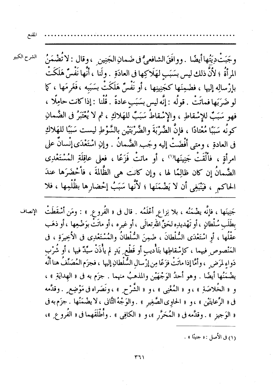 جَنِينَها، فإنَّه يضْمَنُه، بلا نِزاعٍ أعْلَمُه. قال فى «الفُروعِ»: ومَن أسْقَطَتْ بِطَلَبِ سُلْطانٍ، أو تَهْديدِه لحَقِّ اللَّهِ تعالَى، أو غيرِه، أو ماتَتْ بوَضْعِها، أو ذهَب عقْلُها، أوِ اسْتَعْدَى السُّلْطانَ، ضَمِنَ السُّلْطانُ والمُسْتَعْدِى فى الأخِيرَةِ، فى المَنْصوصِ فيهما، كإسْقاطِها بتَأْديبٍ أو قَطْعِ يَدٍ لم يأْذَنْ سيِّدٌ فيها، أو شُرْبِ دَواءٍ لمرَضٍ، وأمَّا إذا ماتَتْ فزَعًا مِن إرْسالِ السُّلْطانِ إليها، فجزَم المُصَنِّفُ هنا أنَّه يضْمَنُها أيضًا. وهو أحدُ الوَجْهَيْن والمذهبُ منهما. جزَم به فى «الهِدايَةِ»، و «الخُلاصَةِ»، و «المُغْنِى»، و «الشَّرْحِ»، ونَصَراه فى مَوْضِعٍ. وقدَّمه فى «الرِّعايتَيْن»، و «الحاوِى الصَّغِيرِ». والوَجْهُ الثَّانى، لا يضْمَنُها. جزَم به فى «الوَجيزِ». وقدَّمه فى «المُحَرَّرِ»، و «الكافِى». وأَطْلَقَهما فى «الفُروعِ»،
