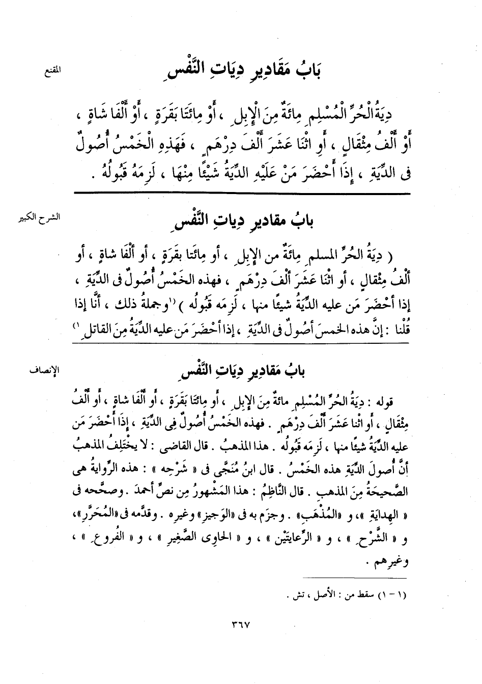 قوله: دِيَةُ الحُرِّ المُسْلِمِ مائةٌ مِنَ الإِبِلِ، أو مِائتَا بَقرَةٍ، أو أَلْفَا شاةٍ، أو أَلْف مِثْقَالٍ، أو اثْنا عَشَرَ أَلْفَ دِرْهَم. فهذه الخَمْسُ أُصُولٌ فى الدِّيَةِ، اذَا أَحْضَرَ مَن عليه الدِّيَةُ شيئًا منها، لَزِمَه قَبُولُه. هذا المذهبُ. قال القاضى: لا يخْتَلِفُ المذهبُ أنَّ أُصولَ الدِّيَةِ هذه الخَمْسُ. قال ابنُ مُنَجَّى فى «شَرْحِه»: هذه الرِّوايةُ هى الصَّحيحَةُ مِنَ المذهبِ. قال النَّاظِمُ: هذا المَشْهورُ مِن نصِّ أحمدَ. وصحَّحه فى «الهِدايَةِ»، و «المُذْهَبِ». وجزَم به فى «الوَجيزِ» وغيرِه. وقدَّمه فى «المُحَرَّرِ»، و «الشَّرْحِ»، و «الرِّعايتَيْن»، و «الحاوِى الصَّغِيرِ»، و «الفُروعِ»، وغيرِهم.