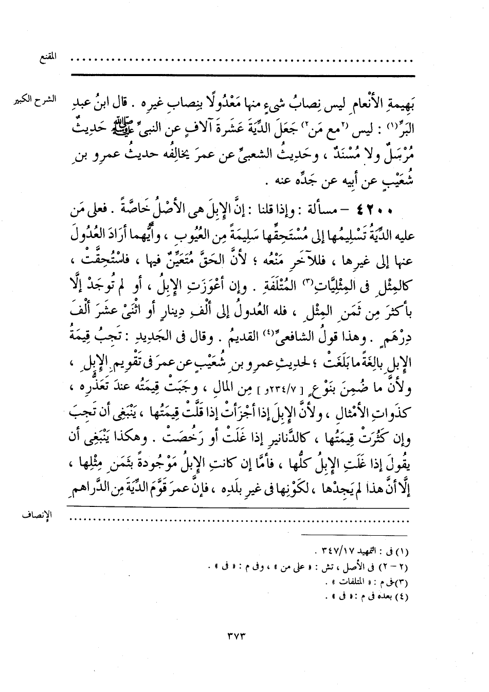 بَهِيمةِ الأنْعامِ ليس نِصابُ شئٍ منها مَعْدُولًا بنِصابِ غيرِه. قال ابنُ عبدِ البَرِّ (¬1): ليس [مع مَن] (¬2) جَعَلَ الدِّيَةَ عَشَرةَ آلافٍ عن النبىِّ -صلى اللَّه عليه وسلم- حَدِيثٌ مُرْسَلٌ ولا مُسْنَدٌ، وحَدِيثُ الشعبىِّ عن عمرَ يخالِفُه حديث عمرِو بنِ شُعَيْبٍ عن أبِيه عن جَدِّه عنه.