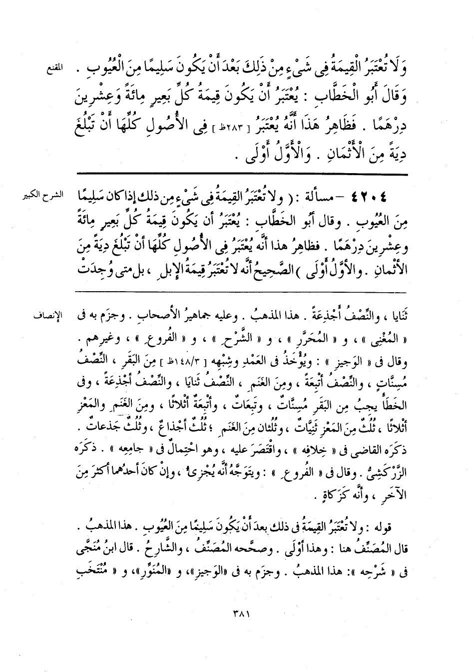 وَلَا تُعْتَبَرُ الْقِيمَةُ فى شَىْءٍ مِنْ ذَلِكَ بَعْدَ أن يَكُونَ سَلِيمًا مِنٍ الْعُيُوبِ. وَقَالَ أَبُو الْخَطَّابِ: يُعْتَبَرُ أَنْ يَكُونَ قِيمَةُ كُلِّ بَعِيرٍ مِائَةً وَعِشْرِينَ دِرْهَمًا. فَظَاهِرُ هَذَا أنَّهُ يُعْتَبَرُ فى الأُصُولِ كُلِّهَا أن تَبْلُغَ دِيَةً مِنَ الْأَثْمَانِ. وَالأوَّلُ أَوْلَى.