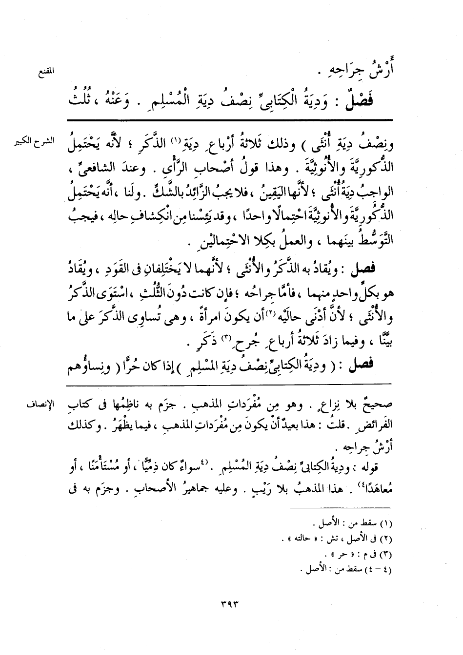 قوله: ودِيةُ الكِتابىِّ نِصْفُ دِيَةِ المُسْلِمِ. [سواءٌ كان ذِمِّيًّا، أو مُسْتَأْمَنًا، أو مُعاهَدًا] (¬1). هذا المذهبُ بلا رَيْبٍ. وعليه جماهيرُ الأصحابِ. وجزَم به فى