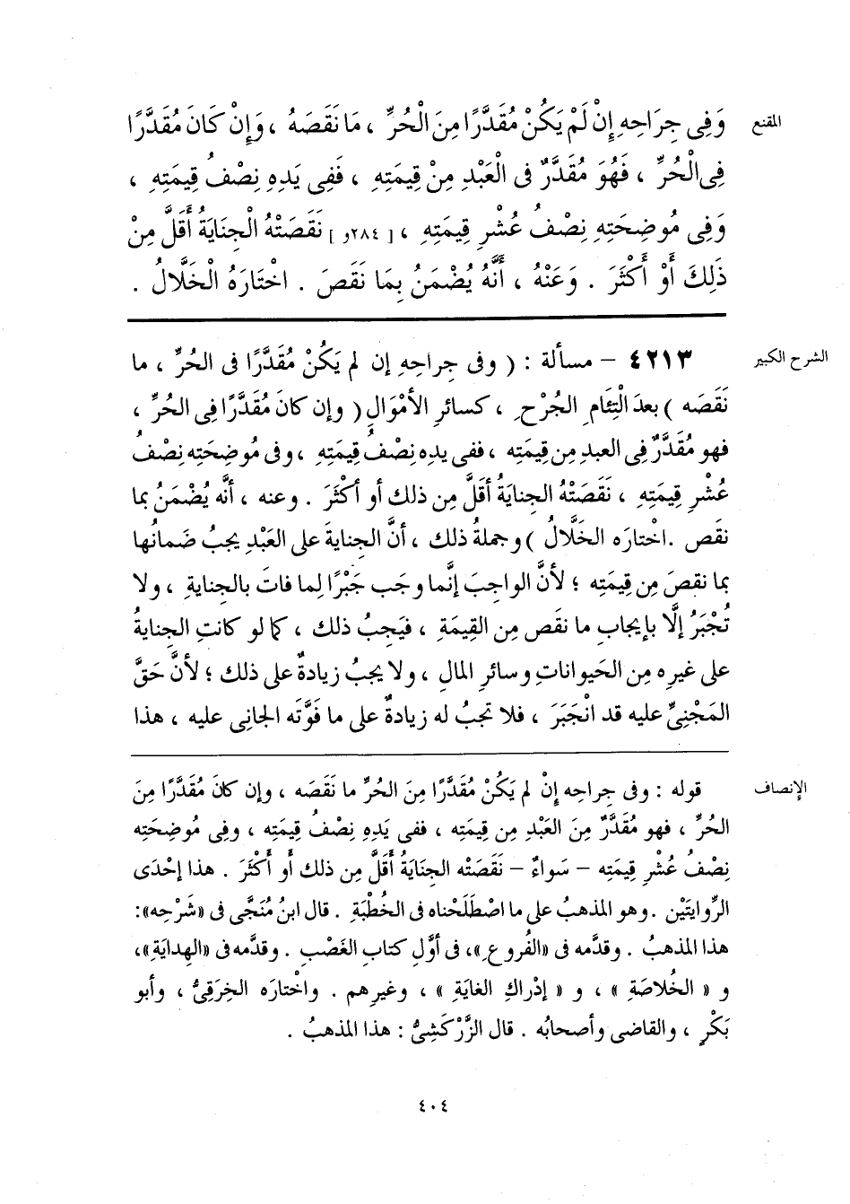 قوله: وفى جِراحِه إِنْ لم يَكُنْ مُقَدَّرًا مِنَ الحُرِّ ما نَقَصَه، وإن كان مُقَدَّرًا مِنَ الحُرِّ، فهو مُقَدَّرٌ مِنَ العَبْدِ مِن قِيمَتِه، ففى يَدِهِ نِصْفُ قِيمَتِه، وفى مُوضِحَتِه نِصْفُ عُشْرِ قِيمَتِه -سَواء- نَقَصَتْه الجِنَايَةُ أَقَلَّ مِن ذلك أَو أَكْثَرَ. هذا إحْدَى الرِّوايتَيْن. وهو المذهبُ على ما اصْطَلَحْناه فى الخُطبةِ. قال ابنُ مُنَجَّى فى «شَرْحِه»: هذا المذهبُ. وقدَّمه فى «الفُروعِ»، فى أوَّلِ كتابِ الغَصْبِ. وقدَّمه فى «الهِدايَةِ»، و «الخُلاصَةِ»، و «إِدْراكِ الغايَةِ»، وغيرِهم. واخْتارَه الخِرَقِىِّ، وأبو بَكْرٍ، والقاضى وأصحابُه. قال الزَّرْكَشِىُّ: هذا المذهبُ.