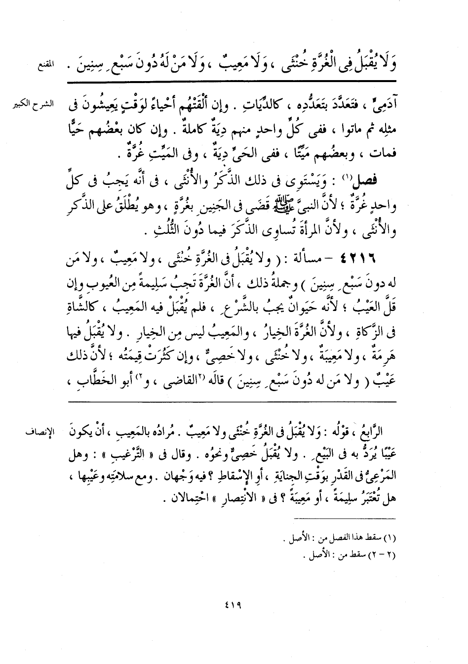الرَّابعُ، قوْلُه: وَلا يُقْبَلُ فى الغُرَّةٍ خُنْثَى ولا مَعِيبٌ. مُرادُه بالمَعِيبِ، أَنْ يكونَ عَيْبًا يُرَدُّ به فى البَيْعِ. ولا يُقْبَلُ خصِىٌّ ونحوُه. وقال فى «التَّرْغيبِ»: وهل المَرْعِىُّ فى القَدْرِ بوَقْتِ الجِنايَةِ، أوِ الإِسْقاطِ؟ فيه وَجْهان. ومع سلامَتِه وعَيْبِها، هل تُعْتَبَرُ سلِيمَةً، أو مَعِيبَةً؟ فى «الانْتِصارِ» احْتِمالان.