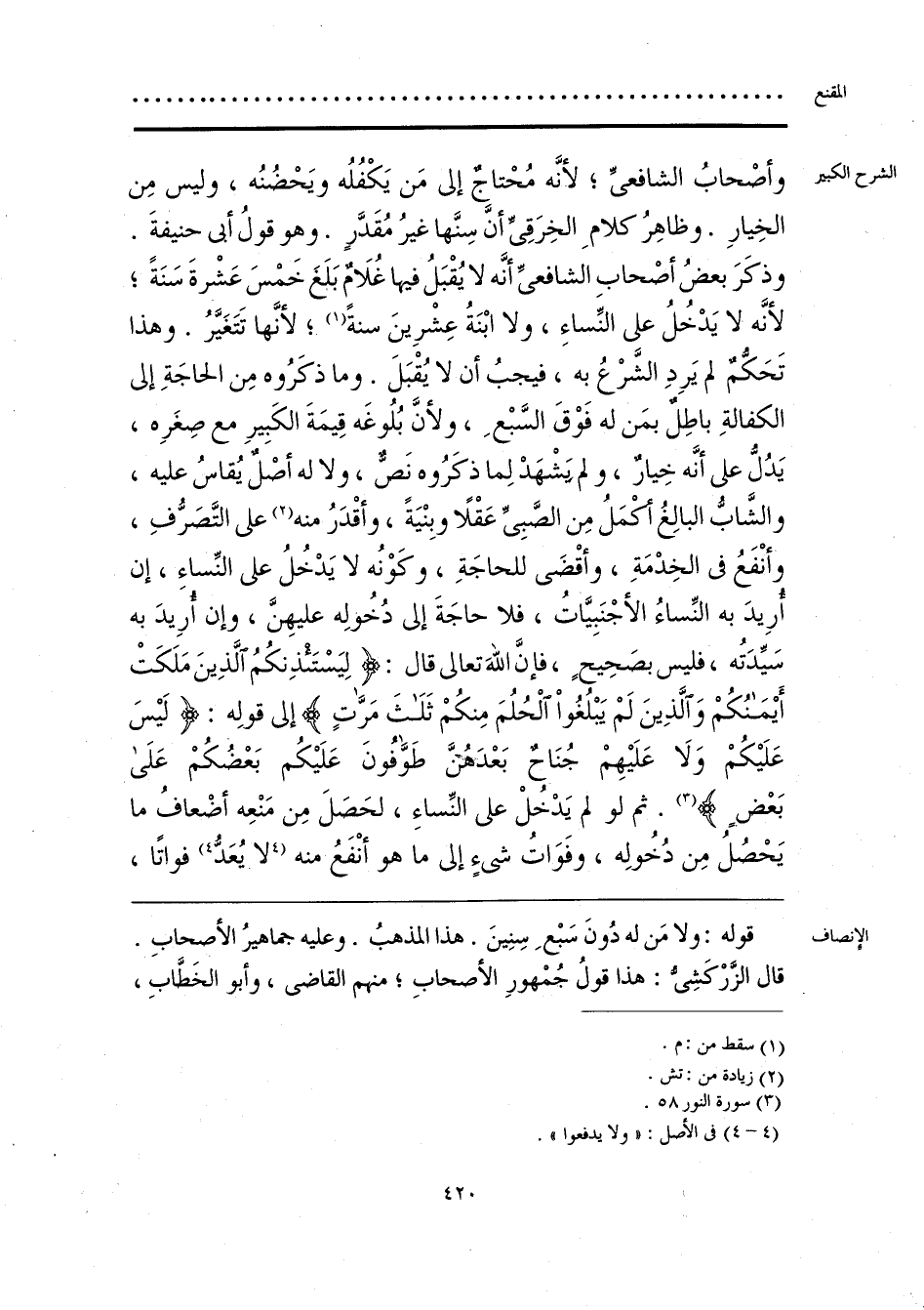 قوله: ولا مَن له دُونَ سَبْعِ سِنِينَ. هذا المذهبُ. وعليه جماهيرُ الأصحابِ. قال الزَّرْكَشِىُّ: هذا قولُ جُمْهورِ الأصحابِ؛ منهم القاضى، وأبو الخَطَّابِ،