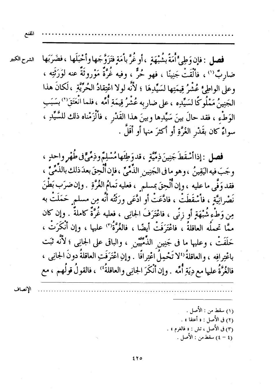 فصل: إذا أسْقَطَ جَنِينَ ذِمِّيَّةٍ، قد وَطِئَها مُسْلِمٌ وذِمِّىٌّ في طُهْرٍ واحدٍ، وجَبَ فيه اليَقِينُ، وهو ما في الجَنِينِ الذِّمِّىِّ، فإن أُلْحِقَ بعدَ ذلك بالذِّمِّىِّ، فقد وَفَّى ما عليه، وإن أُلْحِقَ بمسلمٍ، فعليه تَمامُ الغُرَّةِ. وإن ضرَب بَطْنَ نَصْرانِيَّةٍ، فأَسْقَطَتْ، فادَّعَتْ أو ادَّعَى ورَثَتُه أنَّه مِن مسلمٍ حَمَلَتْ به مِن وَطْءِ شُبْهَةٍ أو زِنًى، فاعْتَرَفَ الجانِى، فعليه غُرَّةٌ كاملةٌ. وإن كان ممَّا تحملُه العاقلةُ، فاعْتَرَفَتْ أَيضًا، فالغُرَّةُ (¬3) عليها، وإن أنْكَرَتْ، حَلَفَتْ، وعليها ما في جَنِينِ الذِّمِّيِّيْنِ، والباقي على الجانِى؛ لأنَّه ثبَت باعْتِرافِه، والعاقلةُ [لا تَحْمِلُ اعْتِرافًا. وإنِ اعْتَرَفَتِ العاقلةُ دونَ الجانِى، فالغُرَّةُ عليها مع دِيَةِ أُمِّه. وإن أنْكَرَ الجانِى والعاقلةُ] (¬4)، فالقولُ قولُهم، مع