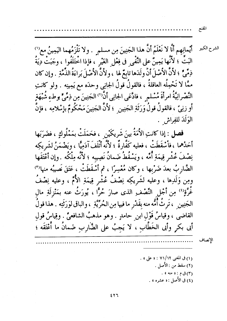 فصل: إذا كانتِ الأمَةُ بينَ شَريكَيْنِ، فحَمَلَتْ بمَمْلُوكٍ، فضَرَبَها أحَدُهما، فأسْقَطَتْ، فعليه كَفَّارة؛ لأنَّه أتْلَفَ آدَمِيًّا، ويَضْمَنُ لشَرِيكِه نِصْفَ عُشْرِ قِيمَةِ أُمِّه، ويَسْقُطُ ضمانُ نَصِيبِه؛ لأنَّه مِلْكُه. وإن أعْتَقَها الضَّارِبُ بعدَ ضَرْبِها، وكان مُعْسِرًا، ثم أسْقَطَتْ، عَتَقَ نَصيبُه منها (¬3) ومِن وَلَدِها، وعليه لشَرِيكِه نِصْفُ عُشْرِ قِيمَةِ الأُمِّ، وعليه نِصْفُ غُرَّةٍ (¬4) مِن أجْل النِّصْفِ الذى صارَ حُرًّا، يُورَثُ عنه بمَنْزِلَةِ مالِ الجَنِينِ، تَرِثُ أُمُّه منه بِقَدْرِ ما فيها مِن الحُرِّيَّةِ، والباقي لوَرَثَتِه. هذا قولُ القاضى، وقياسُ قَوْلِ ابنِ حامدٍ. وهو مذهبُ الشافعىِّ. وقِياسُ قولِ أبى بكرٍ وأبى الخَطَّابِ، لا يَجِبُ على الضَّارِبِ ضَمانُ ما أَعْتَقَه؛