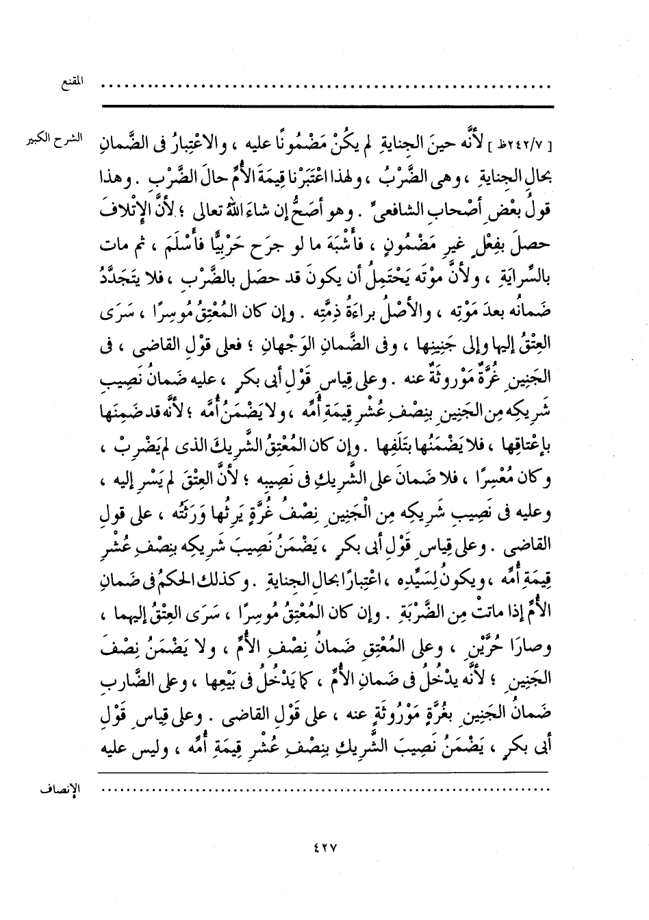 لأنَّه حينَ الجِنايةِ لم يكُنْ مَضْمُونًا عليه، والاعْتِبارُ في الضَّمانِ بحالِ الجِنايةِ، وهى الضَّرْبُ، ولهذا اعْتَبَرْنا قِيمَةَ الأمِّ حالَ الضَّرْبِ. وهذا قولُ بعْضِ أصْحابِ الشافعىِّ. وهو أَصَحُّ إن شاءَ اللَّه تعالى؛ لأَنَّ الإِتْلافَ حصلَ بفِعلٍ غيرِ مَضْمُونٍ، فأَشْبَه ما لو جرَح حَرْبِيًّا فأَسْلَمَ، ثم مات بالسِّرايَةِ، ولأَنَّ موْتَه يَحْتَمِلُ أن يكونَ قد حصَل بالضَّرْبِ، فلا يتَجَدَّدُ ضَمانُه بعدَ مَوْتِه، والأَصْلُ براءَةُ ذِمَّتِه. وإن كان المُعْتِقُ مُوسِرًا، سَرَى العِتْقُ إليها وإلى جَنِينِها، وفى الضَّمانِ الوَجْهانِ؛ فعلى قوْلِ القاضى، في الجَنِينِ غُرَّةٌ مَوْروثَةٌ عنه. وعلى قِياسِ قَوْلِ أبى بكرٍ، عليه ضَمانُ نصِيبِ شَرِيكِه مِن الجَنِينِ بنِصْفِ عُشْرِ قِيمَةِ أُمِّه، ولا يَضْمَنُ أُمَّه؛ لأنَّه قد ضَمِنَها بإعْتاقِها، فلا يَضْمَنُها بتَلَفِها. وإن كان المُعْتِق الشَّرِيكَ الذى لم يَضْرِبْ، وكان مُعْسِرًا، فلا ضَمانَ على الشَّرِيكِ في نَصِيبِه؛ لأَنَّ العِتْقَ لم يَسْرِ إليه، وعليه في نَصِيبِ شَرِيكِه مِن الْجَنِينِ نِصْفُ غُرَّةٍ يَرِثُها وَرَثَتُه، على قولِ القاضى. وعلى قِياسِ قَوْلِ أبى بكرٍ، يَضْمَنُ نَصِيبَ شَرِيكِه بنِصْفِ عُشْرِ قِيمَةِ أُمِّه، ويكونُ لِسَيِّدِه، اعْتِبارًا بحالِ الجِنايةِ. وكذلك الحكمُ في ضَمانِ الأُمِّ إذا ماتت مِن الضَّرْبَةِ. وإن كان المُعْتِقُ مُوسِرًا، سَرَى العِتْقُ إليهما، وصارَا حُرَّيْنِ، وعلى المُعْتِقِ ضَمانُ نصف الأُمِّ، ولا يَضْمَنُ نِصْفَ الجَنِينِ؛ لأنَّه يدْخُلُ في ضَمانِ الأُمِّ، كما يَدْخُلُ في بَيْعِها، وعلى الضَّاربِ ضَمان الجَنِينِ بغُرَّةٍ مَوْرُوثَةٍ عنه، على قَوْلِ القاضى. وعلى قِياسِ قَوْلِ أبى بكرٍ، يَضْمَنُ نَصِيبَ الشَّرِيكِ بنِصْفِ عُشْرِ قِيمَةِ أُمِّه، وليس عليه