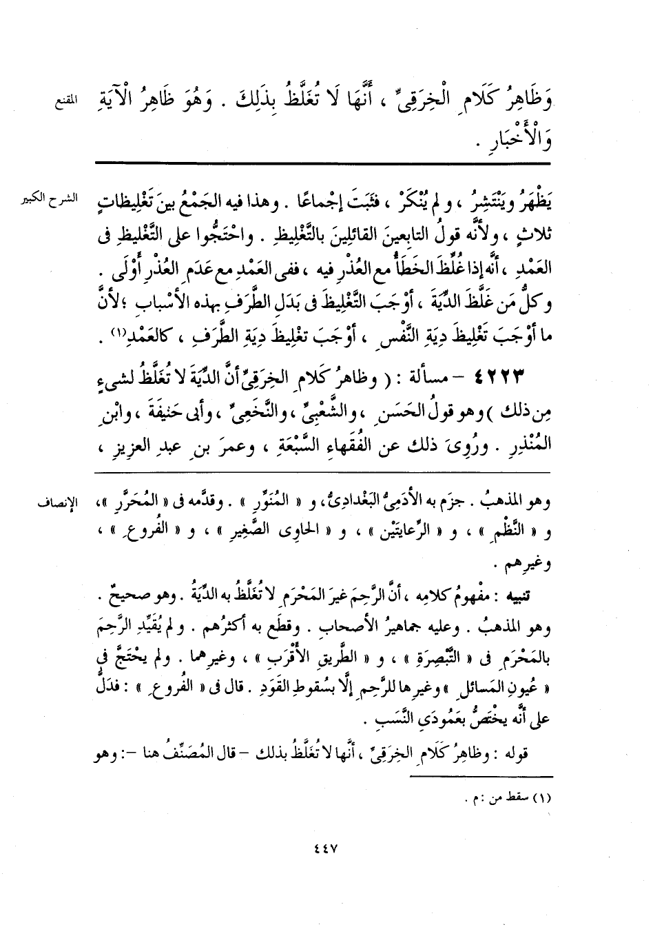 قوله: وظاهِرُ كَلامِ الخِرَقِىِّ، أنَّها لا تُغَلَّظُ بذلك -قال المُصَنِّفُ هنا-: وهو