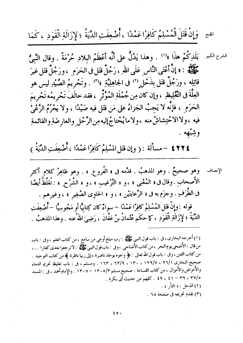 وهو صحيحٌ. وهو المذهبُ. قدَّمه فى «الفُروعِ». وهو ظاهرُ كلامِ أكثرِ الأصحابِ. وقال فى «المُغْنِى»، و «التَّرْغيبِ»، و «الشَّرْحِ»: تُغَلَّظُ أَيضًا فى الطَّرَفِ. وجزَم به فى «الرِّعايتَيْن»، و «الحاوِى الصَّغِيرِ»، وغيرِهم. قوله: وإنْ قتَل المُسْلِمُ كافِرًا عَمْدًا -سواء كان كِتابِيًا أو مَجُوسيًا- أُضْعِفَتِ الدِّيَةُ؛ لإِزَالَةِ الْقَوَدِ، كما حكَم عُثْمانُ بنُ عَفَّانَ، رَضِىَ اللَّهُ عنه. وهذا المذهبُ.