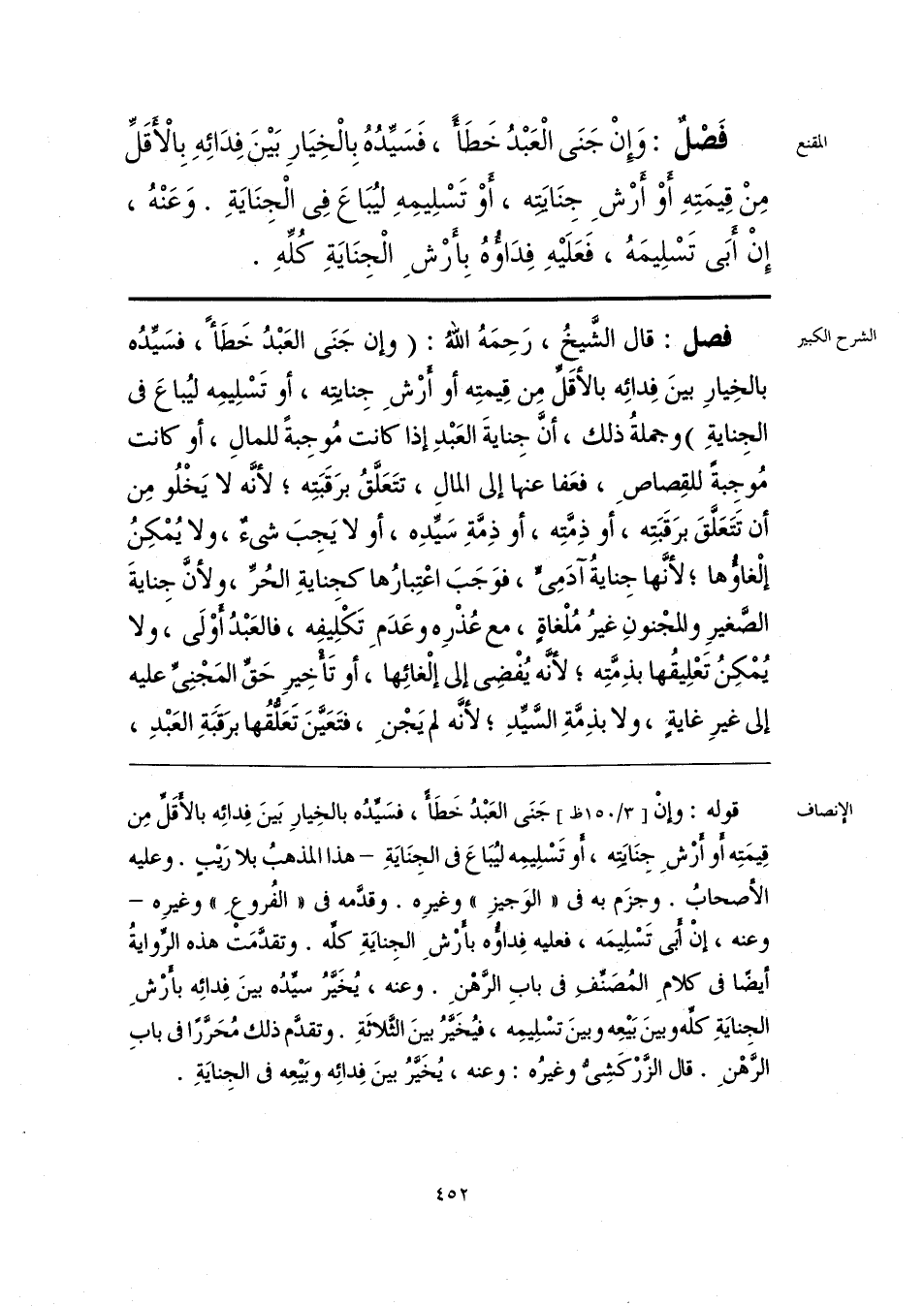 فَصْلٌ: وَإِنْ جَنَى الْعَبْدُ خَطَأً، فَسَيِّدُهُ بِالْخِيَارِ بَيْنَ فِدَائهِ بِالأَقَلِّ مِنْ قِيمَتِهِ أو أَرْشِ جِنَايَتِه، أَوْ تَسْلِيمِهِ ليُبَاعَ فى الْجِنَايَةِ. وَعَنْهُ، إِنْ أَبَى تَسْلِيمَهُ، فَعَلَيْهِ فِدَاؤُهُ بِأَرْشِ الْجِنَايَةِ كُلِّهِ.