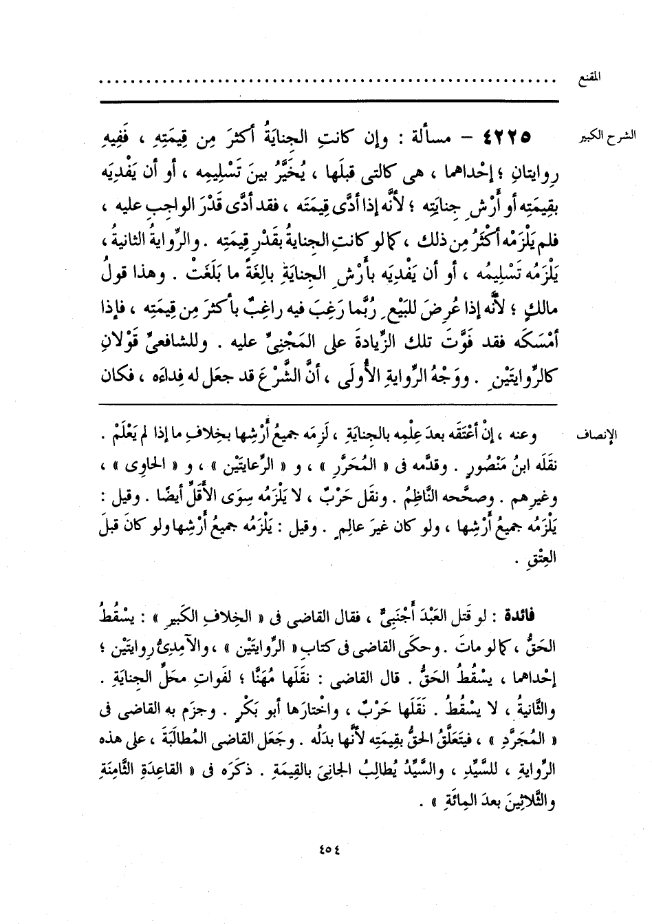 وعنه، إنْ أعْتَقَه بعدَ عِلْمِه بالجِنايَةِ، لَزِمَه جميعُ أَرْشِها بخِلافِ ما إذا لم يَعْلَمْ. نقَلَه ابنُ مَنْصُورٍ. وقدَّمه فى «المُحَرَّرِ»، و «الرِّعايتَيْن»، و «الحاوِى»، وغيرِهم. وصحَّحه النَّاظِمُ. ونقَل حَرْبٌ، لا يَلْزَمُه سِوَى الأَقَلِّ أيضًا. وقيل: يَلْزَمُه جميعُ أَرْشِها، ولو كان غيرَ عالِمٍ. وقيل: يَلْزَمُه جميعُ أَرْشِها ولو كانَ قبلَ العِتْقِ.