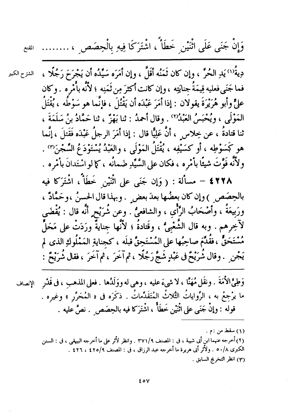 وَإِنْ جَنَى عَلَى اثْنَيْنِ خَطَأً، اشْتَرَكَا فِيهِ بِالْحِصَصِ،