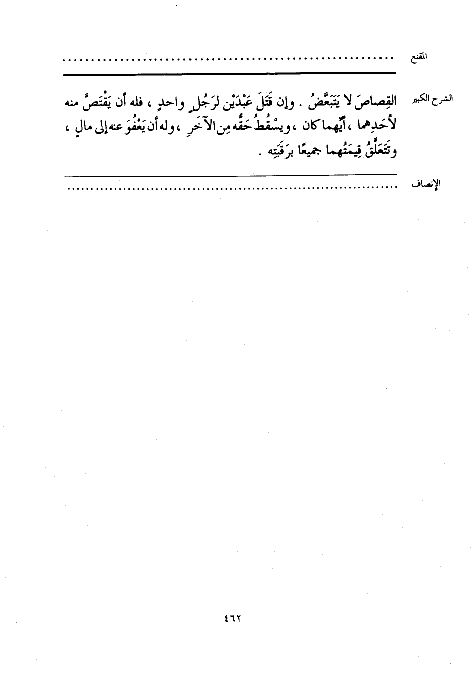 القِصاصَ لا يَتَبَعَّضُ. وإن قَتَلَ عَبْدَيْن لرَجُلٍ واحدٍ، فله أن يَقْتَصَّ منه لأحَدِهما، أيِّهما كان، ويسْقُطُ حَقُّه مِن الآخرِ، وله أن يَعْفُوَ عنه إلى مالٍ، وتَتَعَلَّقُ قِيمَتُهما جميعًا برَقَبَتِه.