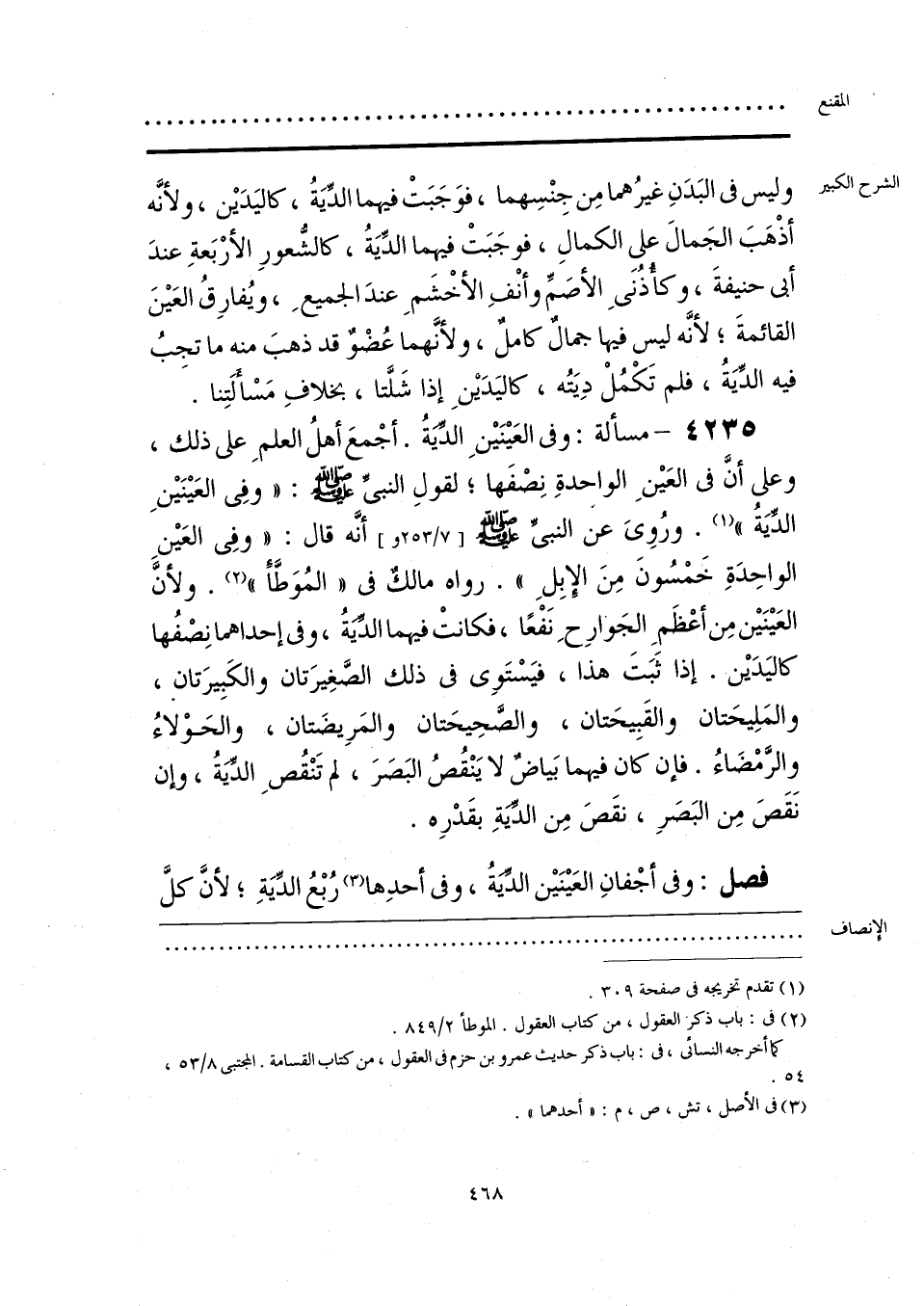 4235 - مسألة: وفى العَيْنَيْنِ الدِّيَةُ. أجْمعَ أهلُ العلمِ على ذلك، وعلى أنَّ في العَيْنِ الواحدةِ نِصْفَها؛ لقولِ النبىِّ -صلى اللَّه عليه وسلم-: «وفِى العَيْنَيْنِ الدِّيَةُ» (¬1). ورُوِىَ عن النبىِّ -صلى اللَّه عليه وسلم- أنَّه قال: «وفِى العَيْنِ الواحِدَةِ خَمْسُونَ مِنَ الإِبِلِ». رواه مالكٌ في «المُوَطَّأَ» (¬2). ولأَنَّ العَيْنَيْن مِن أعْظَمِ الجَوارِحِ نَفْعًا، فكانتْ فيهما الدِّيَةُ، وفى إحداهما نِصْفُها كاليَدَيْن. إذا ثَبَتَ هذا، فيَسْتَوِى في ذلك الصَّغِيرَتان والكَبِيرَتان، والمَلِيحَتان والقَبِيحَتان، والصَّحِيحَتان والمَرِيضَتان، والحَوْلاءُ وِالرَّمْضَاءُ. فإن كان فيهما بَياضٌ لا يَنْقُصُ البَصَرَ، لم تَنْقُصِ الدِّيَةُ، وإن نقَصَ مِن البَصَرِ، نقَصَ مِن الدِّيَةِ بقَدْرِه.
