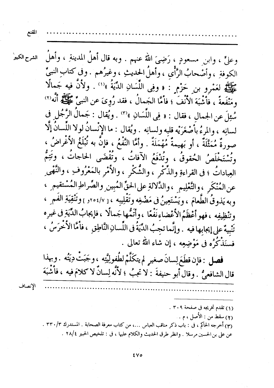 وعلىٍّ، وابنِ مسعودٍ، رَضِىَ اللَّهُ عنهم. وبه قال أهلُ المدينةِ، وأهلُ الكوفةِ، وأصْحابُ الرَّأْى، وأهلُ الحديثِ، وغيرُهم. وفى كتابِ النبىِّ -صلى اللَّه عليه وسلم- لعَمْرِو بنَ حَزْمٍ: «وفِى اللِّسَانِ الدِّيَةُ» (¬1). ولأَنَّ فيه جَمالًا ومَنْفَعةً، فأشْبَهَ الأنْفَ؛ فأمَّا الجَمالُ، فقد رُوِى عن النبىِّ -صلى اللَّه عليه وسلم- أنَّه (¬2) سُئِلَ عن الجمالِ، فقال: «في اللِّسَانِ» (¬3). ويُقال: جَمالُ الرَّجُلِ في لسانِه، والمرءُ بأصْغَرَيْه قلبِه ولسانِه. ويُقال: ما الإِنْسانُ لولا اللِّسانُ إلَّا صورةٌ مُمَثَّلَةٌ، أو بَهيمةٌ مُهْمَلَةٌ. وأمَّا النَّفْعُ، فإنَّ به تُبْلَغُ الأغْراضُ، وتُسْتَخْلَصُ الحُقوقُ، وتُدْفَعُ الآفاتُ، وتُقْضَى الحاجاتُ، وتَتِمُّ العِباداتُ؛ في القراءةِ والذِّكْرِ، والشُّكْرِ، والأمْرِ بالمَعْرُوفِ، والنَّهْىِ عن المُنْكَرِ، والتَّعْلِيمِ، والدَّلالةِ على الحقِّ المُبِينِ والصِّراطِ المُسْتقيمِ، وبه يَذوقُ الطَّعامَ، ويَسْتَعِينُ في مَضْغِه وتَقْلِيبِه، وتَنْقِيَةِ الفَمِ، وتنْظِيفِه، فهو أعْظَمُ الأعْضاءِ نَفْعًا، وأتَمُّها جَمالًا، فإيجابُ الدِّيَةِ في غيرِه تَنْبِيهٌ على إيجابِها فيه. وإنَّما تجِبُ الدِّيَةُ في اللِّسانِ النَّاطِقِ، فأمَّا الأخْرَسُ، فسنَذْكُرُه في مَوْضِعِه، إن شاء اللَّهُ تعالى.