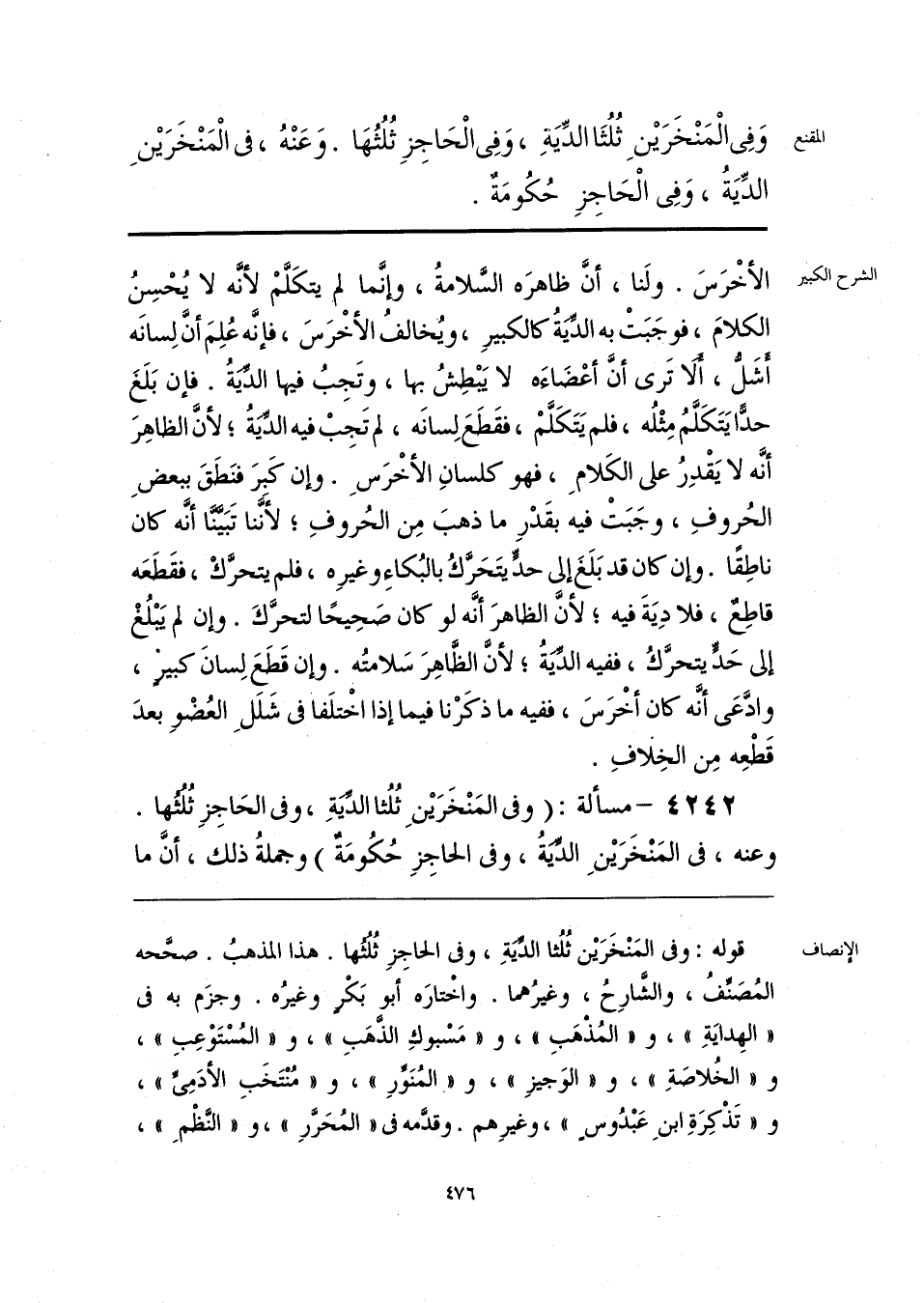 قوله: وفى المَنْخَرَيْن ثُلُثا الدِّيَةِ، وفى الحاجِزِ ثُلُثُها. هذا المذهبُ. صحَّحه المُصَنِّفُ، والشَّارِحُ، وغيرُهما. واختارَه أبو بَكْرٍ وغيرُه. وجزَم به فى «الهِدايَةِ»، و «المُذْهَبِ»، و «مَسْبوكِ الذَّهبِ»، و «المُسْتَوْعِبِ»، و «الخُلاصَةِ»، و «الوَجيزِ»، و «المُنَوِّرِ»، و «مُنْتَخَبِ الأدَمِىِّ» و «تَذْكِرَةِ ابنِ عَبْدُوسٍ»، وغيرِهم. وقدَّمه فى «المُحَرَّرِ»، و «النَّظْمِ»،