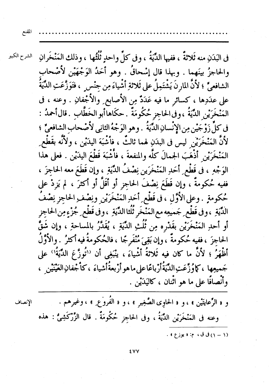 وعنه فى المَنْخَرَيْن الدِّيَةُ، وفى الحاجِزِ حُكومَةٌ. قال الرَّزْكشِىُّ: هذه