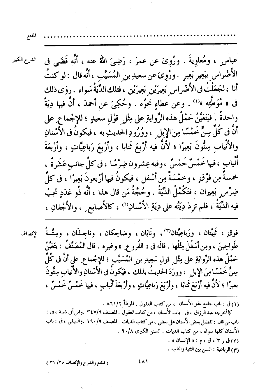 فوقٍ ثَنِيَّتان، ورَباعِيَّتان (¬1)، ونَابَان، وضاحِكان، وناجِذَان، وسِتَّةُ طَواحِينَ، ومِن أسَفْلَ مِثْلُها. قالَه فى «الفُروعِ» وغيرِه. قال المُصَنِّفُ: يتَعَيَّنُ حَمْلُ هذه الرِّوايَةِ على مِثْلِ قولِ سَعِيدِ بنِ المُسَيَّبِ؛ للإِجْماعِ على أنَّ فى كُلِّ سِنٍّ خَمْسًا مِنَ الإِبلِ، وورَدَ الحدِيثُ بذلك، فيَكونُ فى الأسْنانِ والأَنْيابِ سِتُّون بعيرًا؛ لأَنَّ فيه أرْبَعَ ثَنايَا، وأرْبَعَ رَباعِيَّاتٍ، وأرْبعَةَ أنْيابٍ، فيها خَمْسٌ خَمْسٌ،