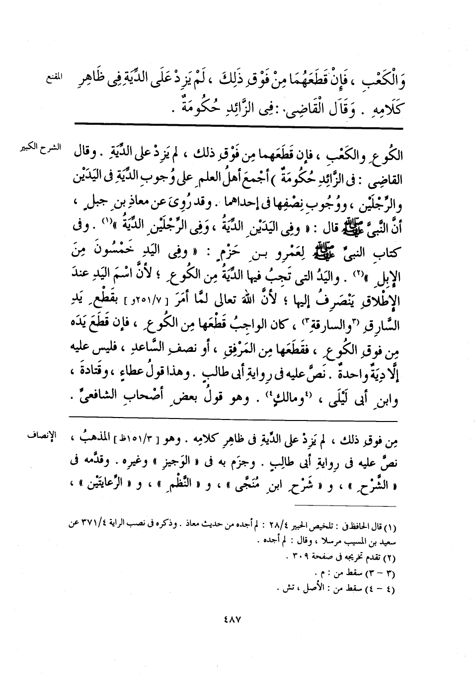 وَالْكَعْبِ، فَإِنْ قَطَعَهُمَا مِنْ فَوْقِ ذَلِكَ، لَمْ يَزِدْ عَلَى الدِّيَةِ فى ظَاهِرِ كَلَامِهِ. وَقَاَل الْقَاضِى: فى الزَّائِدِ حُكُومَةٌ.