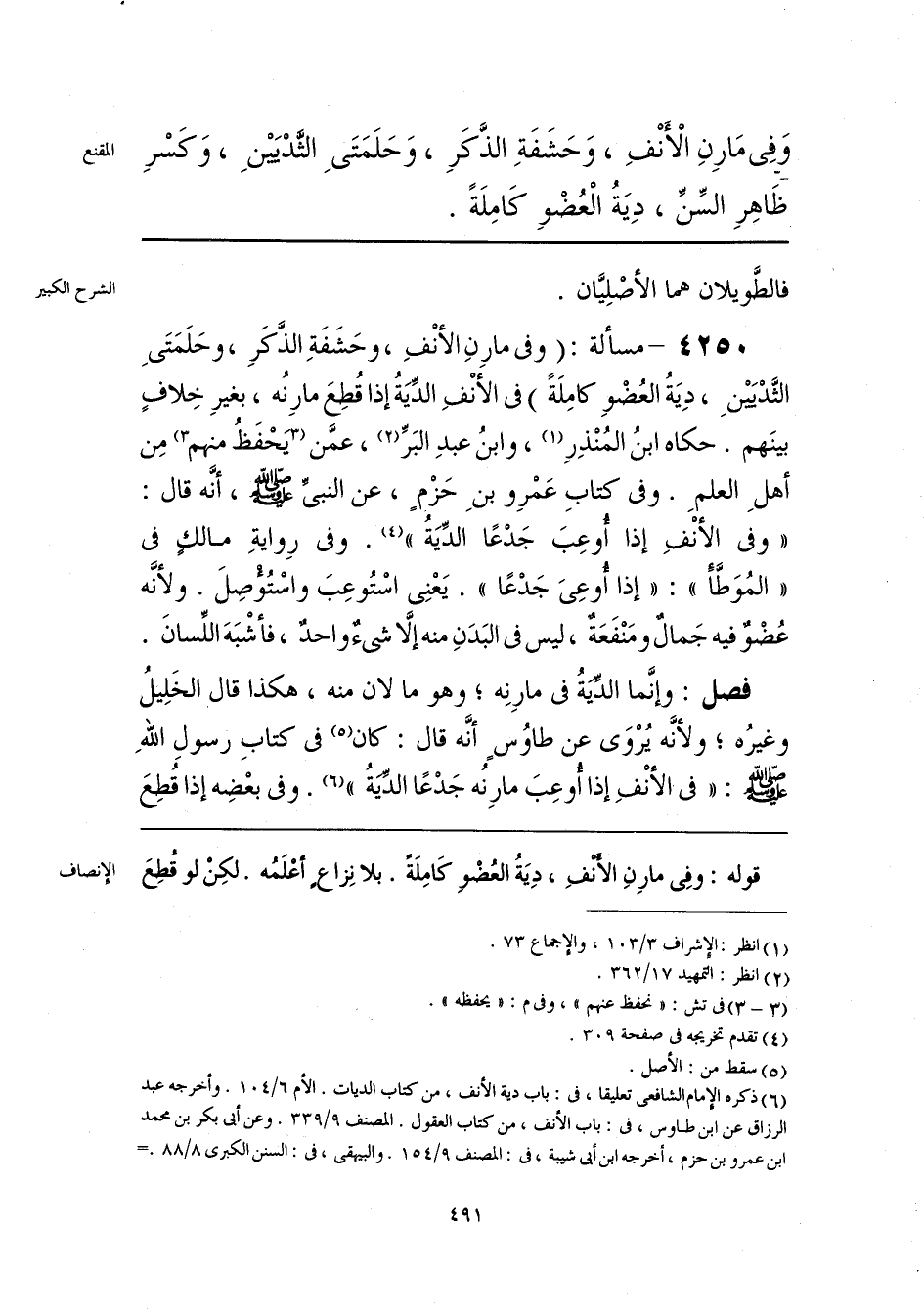 وَفِى مَارِنِ الأَنْفِ، وَحَشَفَةِ الذَّكَرِ، وَحَلَمَتَىِ الثَّدْيَيْن، وَكَسْرِ ظَاهِرِ السِّنِّ، دِيَةُ الْعُضْوِ كَامِلَةً.