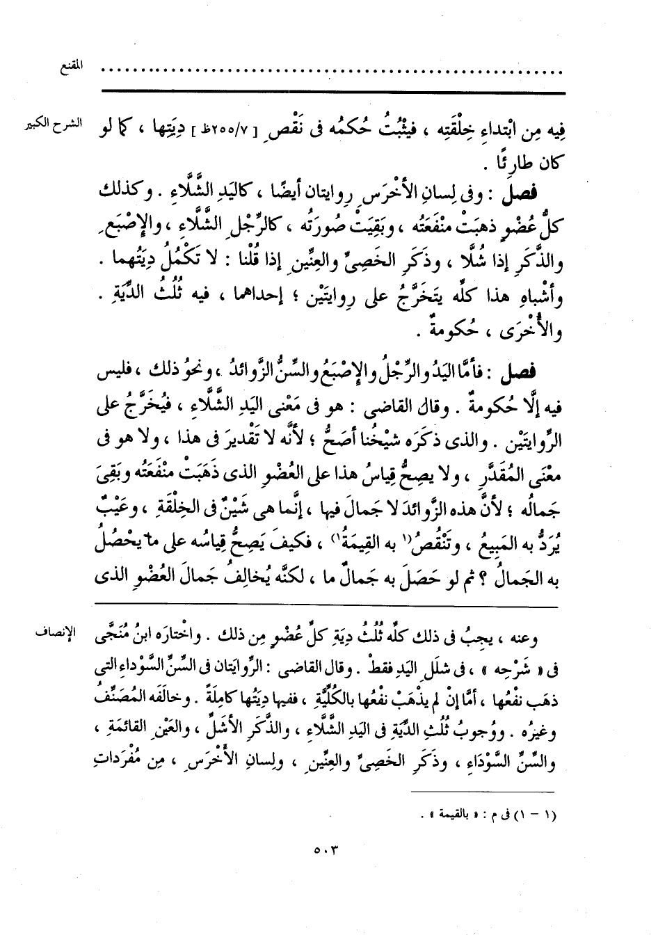 وعنه، يجِبُ فى ذلك كلِّه ثُلُثُ دِيَةِ كلِّ عُضْوٍ مِن ذلك. واخْتارَه ابنُ مُنَجَّى فى «شَرحِه»، فى شلَلِ اليَدِ فقطْ. وقال القاضى: الرِّوايَتان فى السِّنِّ السَّوْداءِ التى ذهَب نفْعُها، أمّا إنْ لم يذْهَبْ نفْعُها بالكُلِّيَّةِ، ففيها دِيَتُها كامِلَةً. وخالَفَه المُصَنِّفُ وغيرُه. ووُجوبُ ثُلُثِ الدِّيَةِ فى اليَدِ الشَّلَّاءِ، والذَّكَرِ الأشَلِّ، والعَيْنِ القائمَةِ، والسِّنِّ السَّوْدَاءِ، وذَكَرِ الخَصِىِّ والعِنِّينِ، ولِسانِ الأَخْرَسِ، مِن مُفْرَداتِ