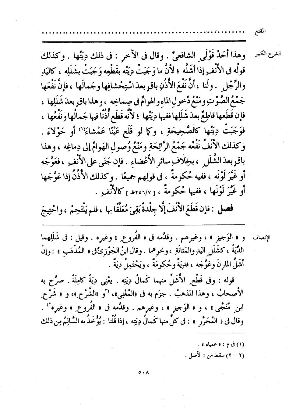 و «الوَجيزِ»، وغيرِهم. وقدَّمه فى «الفُروعِ» وغيرِه. وقيل: فى شَلَلِهما الدِّيَةُ، كشَلَلِ اليَدِ والمَثانَةِ، ونحوِهما. وقال ابنُ الجَوْزِىِّ فى «المُذْهَبِ»: وإنْ أشَلَّ المارِنَ وعَوَّجَه، فدِيَةٌ وحُكومَةٌ، ويَحْتَمِلُ دِيَةٌ.