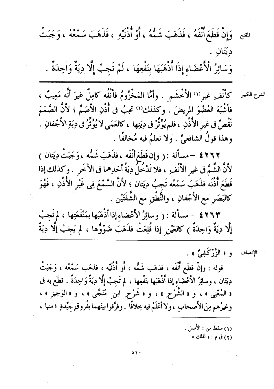 قوله: وإنْ قطَع أَنْفَه، فذهَب شَمُّه، أَو أُذُنَيْه، فذهَب سَمْعُه، وَجَبَتْ دِيَتَان، وساِئِرُ الأَعْضَاءِ إذا أَذْهَبَها بنَفْعِها، لم تَجِبْ إلَّا دِيَةٌ وَاحِدَةٌ. قطَع به فى «المُغْنِى»، و «الشَّرْحِ»، و «شَرْحِ ابنِ مُنَجَّى»، و «الوَجيزِ»، وغيرُهم مِنَ الأصحابِ، ولا أعْلَمُ فيه خِلافًا. وفرَّقوا بينَهما بفُروقٍ جِيِّدةٍ؛ منها،