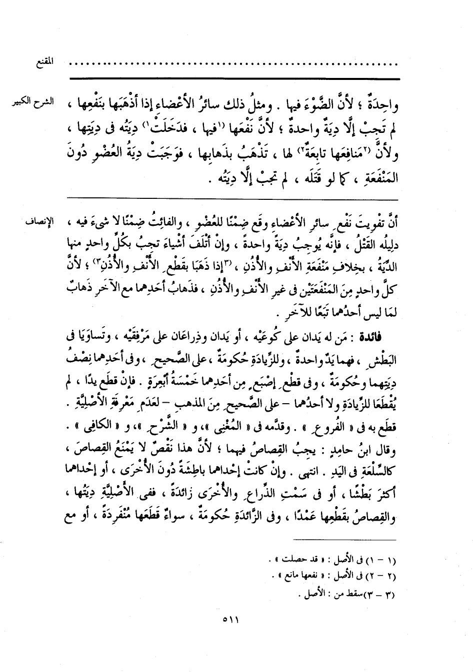 أنَّ تفْوِيتَ نَفْعِ سِائرِ الأعْضاءِ وقَع ضِمْنًا للعُضْوِ، والفائِتُ ضِمْنًا لا شئَ فيه، دلِيلُه القَتْلُ، فإنَّه يُوجِبُ دِيَةً واحدةً، وإنْ أتْلَفَ أشياءَ تجبُ بكُلِّ واحدٍ منها الدِّيَةُ، بخِلافِ مَنْفَعَةِ الأَنْفِ والأُذُنِ، [إذا ذَهَبَا بقَطْعِ الأَنْفِ والأُذُنِ] (¬1)؛ لأَنَّ كلَّ واحدٍ مِنَ المَنْفَعَتَيْن فى غيرِ الأَنْفِ والأُذُنِ، فذَهابُ أحَدِهما مع الآخَرِ ذَهابٌ لمَا ليس أحدُهما تَبَعًا للآخَرِ.