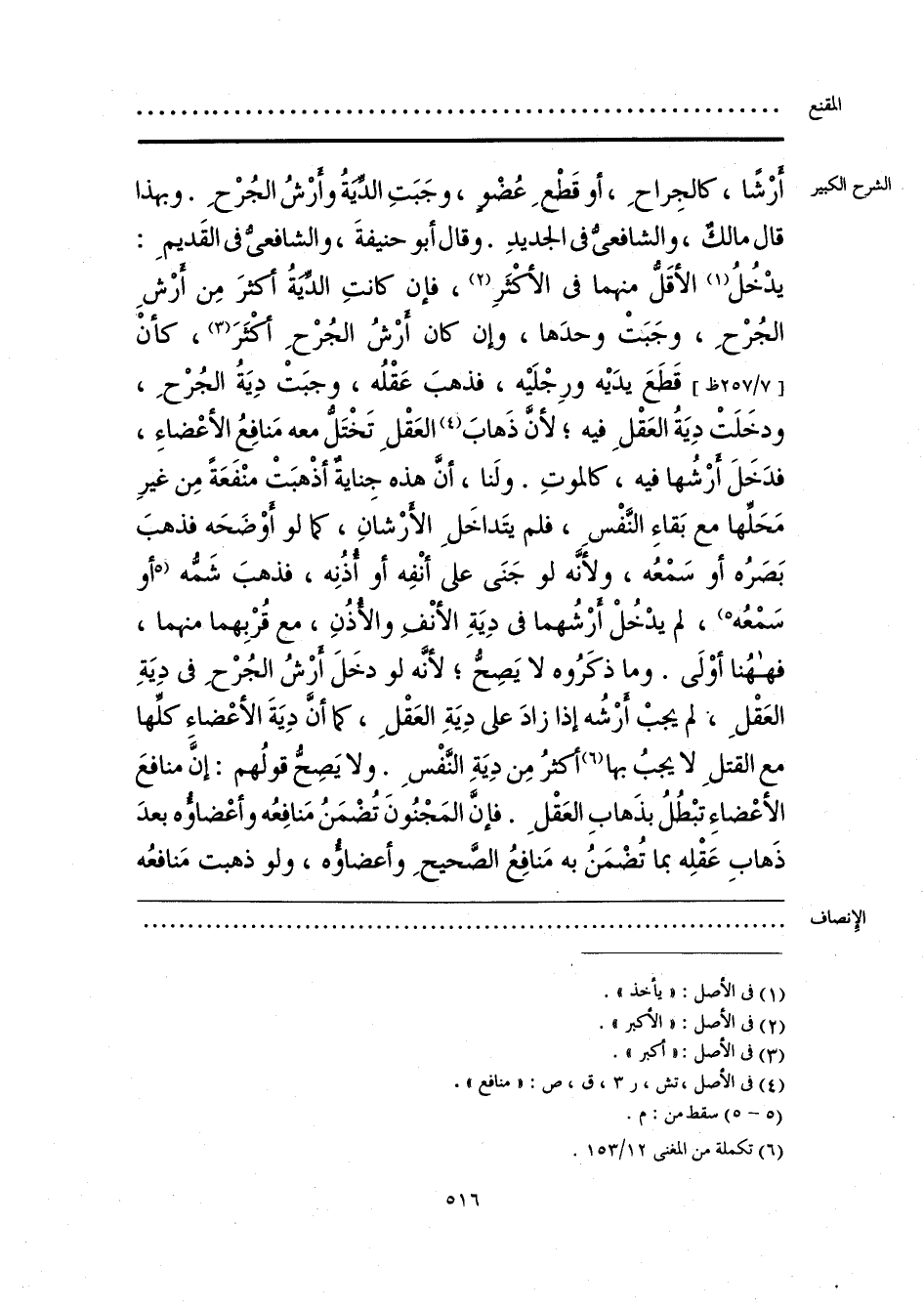 أَرْشًا، كالجِراحِ، أو قَطْعِ عُضْوٍ، وجَبَتِ الدِّيَةُ وأَرْشُ الجُرْحِ. وبهذا قال مالكٍ، والشافعىُّ في الجديدِ. وقال أبو حنيفةَ، والشافعىُّ في القَديمِ: يدْخُلُ (¬1) الأقَلُّ منهما في الأكْثَرِ (¬2)، فإن كانتِ الدِّيَةُ أكثرَ مِن أَرْشِ الجُرْحِ، وجَبَتْ وحدَها، وإن كان أَرْشُ الجُرْحِ أكْثَرَ (¬3)، كأنْ قَطَعَ يدَيْه ورِجْلَيْه، فذهبَ عَقْلُه، وجبَتْ دِيَةُ الجُرْحِ، ودخَلَتْ دِيَةُ العَقْلِ فيه؛ لأَنَّ ذَهابَ (¬4) العَقْلِ تَخْتَلُّ معه مَنافِعُ الأعْضاءِ، فدَخَلَ أَرْشُها فيه، كالموتِ. ولَنا، أنَّ هذه جِناية أذْهبَتْ منْفعَةً مِن غيرِ مَحَلِّها مع بَقاءِ النَّفْسِ، فلم يتَداخَلِ الأَرْشانِ، كما لو أَوضَحَه فذهبَ بَصَرُه أو سَمْعُه، ولأنَّه لو جَنَى على أنْفِه أو أُذُنِه، فذهبَ شَمُّه [أو سَمْعُه] (¬5)، لم يدْخُلْ أَرْشُهما في دِيَةِ الأنْفِ والأذُنِ، مع قُرْبِهما منهما، فههُنا أوْلَى. وما ذكَرُوه لا يَصِحُّ؛ لأنَّه لو دخَلَ أَرْشُ الجُرْحِ في ديَةِ العَقْلِ، لم يجبْ أَرْشُه إذا زادَ على دِيَةِ العَقْلِ، كما أنَّ دِيَةَ الأعْضاء كلِّها مع القتلِ لا يجبُ بها (¬6) أكثرُ مِن دِيَةِ النَّفْسِ. ولا يَصِحُّ قولُهم: إنَّ منافعَ الأعْضاءِ تبْطُلُ بذَهابِ العَقْلِ. فإنَّ المَجْنُونَ تُضْمَنُ مَنافِعُه وأعْضاؤُه بعدَ ذَهابِ عَقْلِه بما تُضْمَنُ به مَنافِعُ الصَّحيحِ وأعضاؤُه، ولو ذهبت مَنافعُه