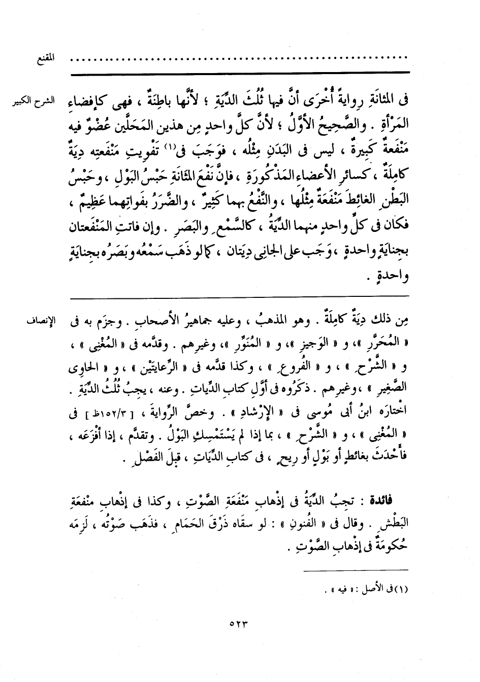 مِن ذلك دِيَةٌ كامِلَةٌ. وهو المذهبُ، وعليه جماهيرُ الأصحابِ. وجزَم به فى «المُحَرَّرِ»، و «الوَجيزِ»، و «المُنَوِّرِ»، وغيرِهم. وقدَّمه فى «المُغْنِى»، و «الشَّرْحِ»، و «الفُروعِ»، وكذا قدَّمه فى «الرِّعايَتَيْن»، و «الحاوِى الصَّغِيرِ»، وغيرِهم. ذكَرُوه فى أوَّلِ كتابِ الدِّياتِ. وعنه، يجِبُ ثُلُثُ الدِّيَةِ. اخْتارَه ابنُ أبى مُوسى فى «الإِرْشادِ». وخصَّ الرِّوايةَ، فى «المُغْنِى»، و «الشَّرْحِ»، بما إذا لم يَسْتَمْسِكِ البَوْلُ. وتقدَّم، إذا أفْزَعَه، فأحْدَثَ بغائطٍ أو بَوْلٍ أو رِيحٍ، فى كتابِ الدِّيَاتِ، قيلَ الفَصْلِ.