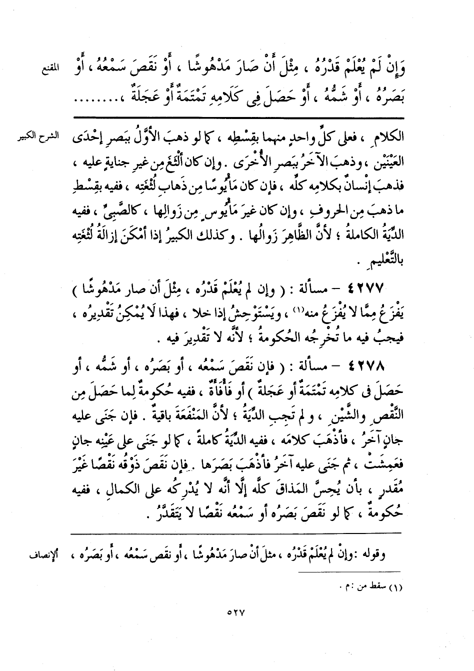 وَإِنْ لَمْ يُعْلَمْ قَدْرُهُ، مِثْلَ أَنْ صَارَ مَدْهُوشًا، أَوْ نَقَصَ سَمْعُهُ، أَوْ بَصَرُهُ، أو شَمُّهُ، أو حَصَلَ فى كَلَامِهِ تَمْتَمَةٌ أَوْ عَجَلَةٌ،